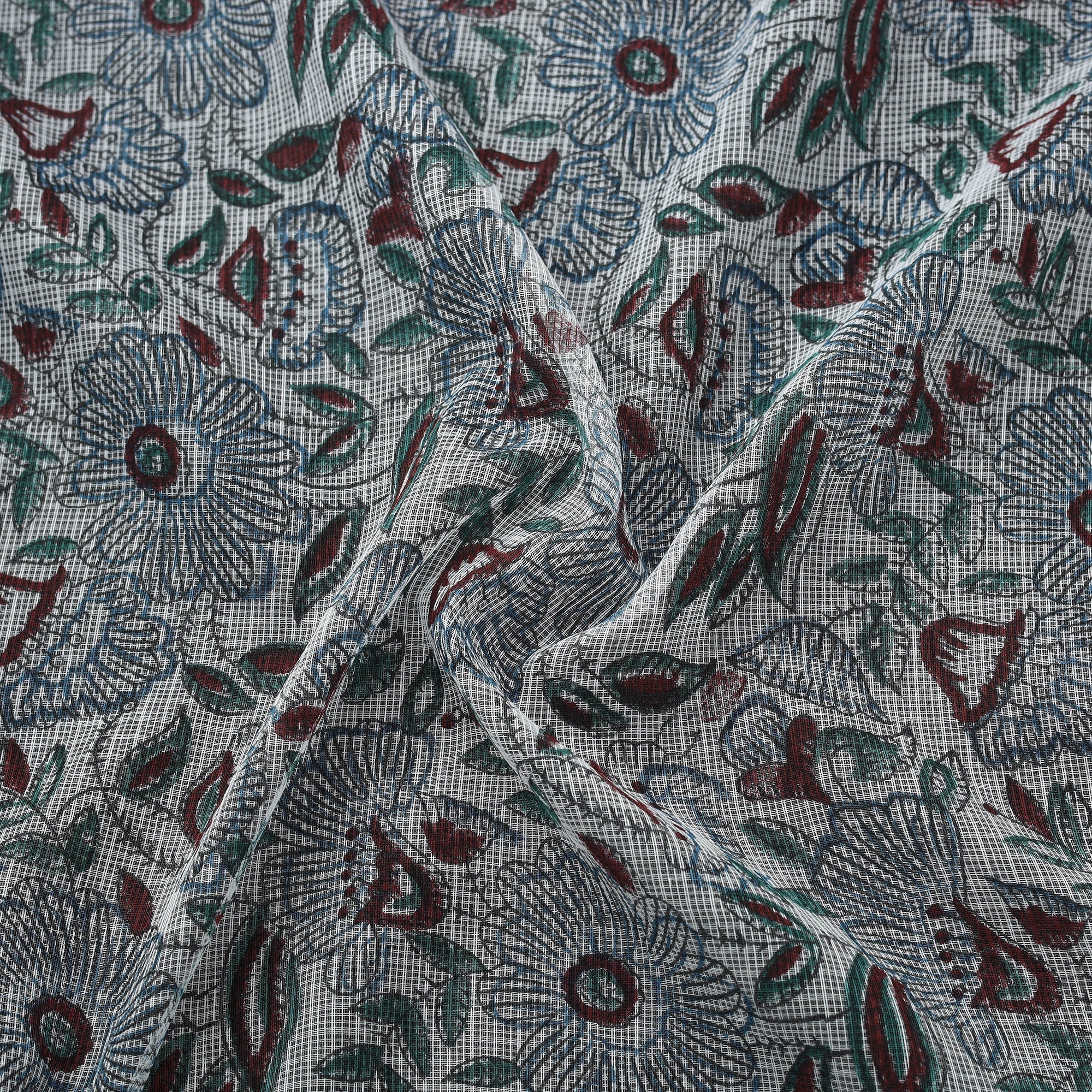 White - Kota Doria Cotton Hand Block Sanganeri Print Fabric 05