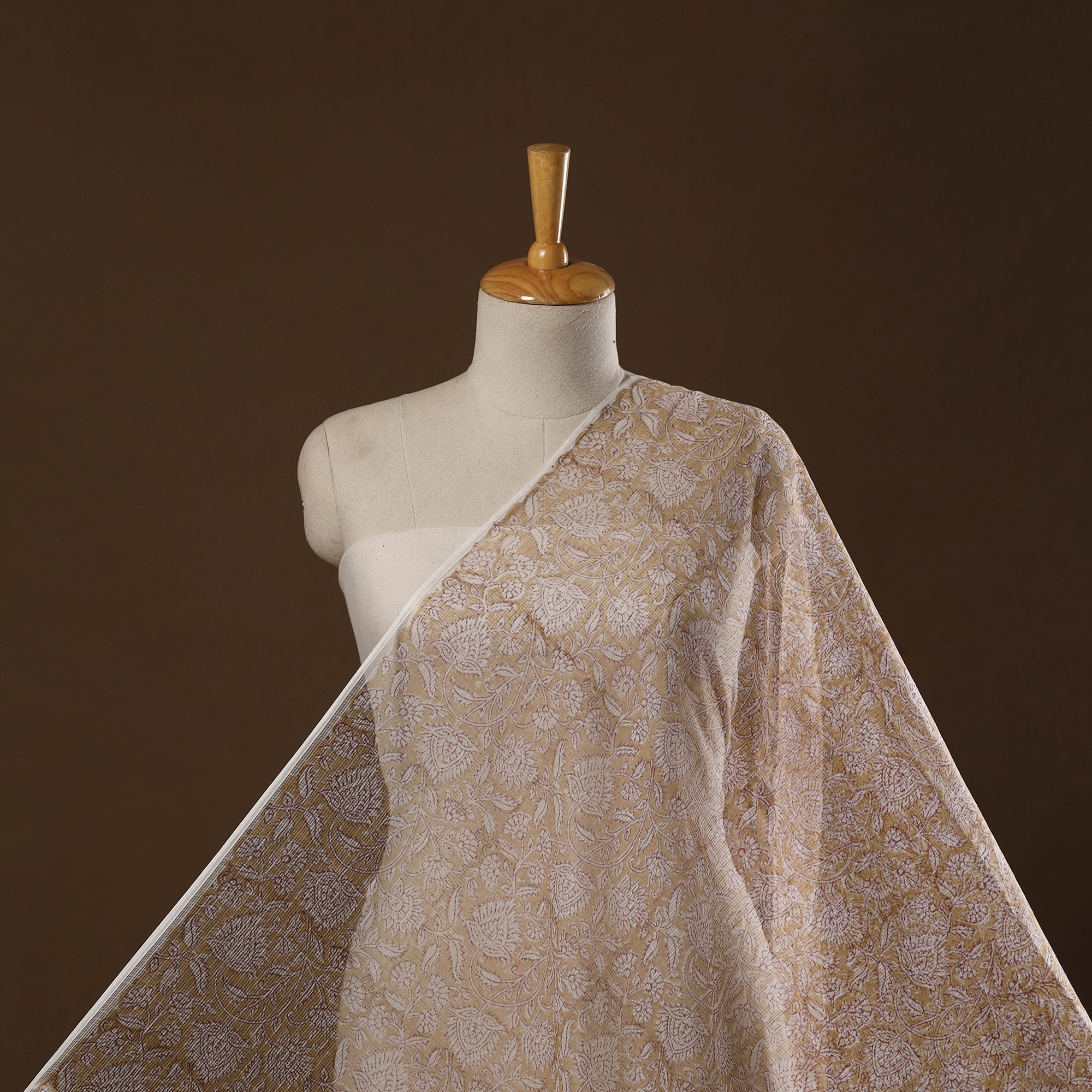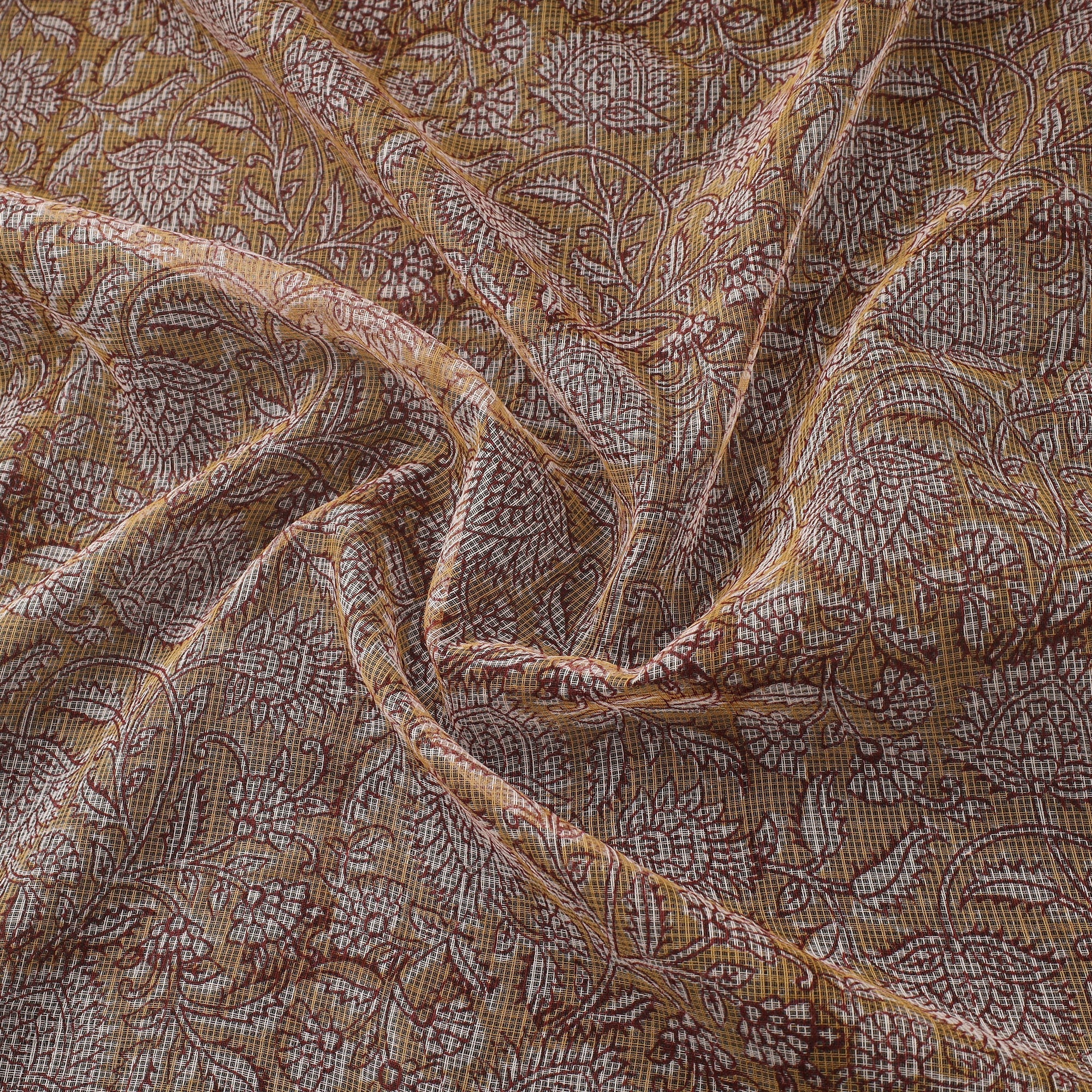 Brown sanganeri hand block print kota doria cotton fabric by artisan Purushottam Chhipa from Jaipur, Rajasthan. This centuries-old block printing technique has been practiced for over 500 years and is known for its fine detailing and delicate floral patterns. The designs are printed using traditional hand-carved wooden blocks and bleed-free VAT dyes. The breathable, lightweight fabric can be used for making sarees, suits, dupattas, kurtas, dresses & stoles.