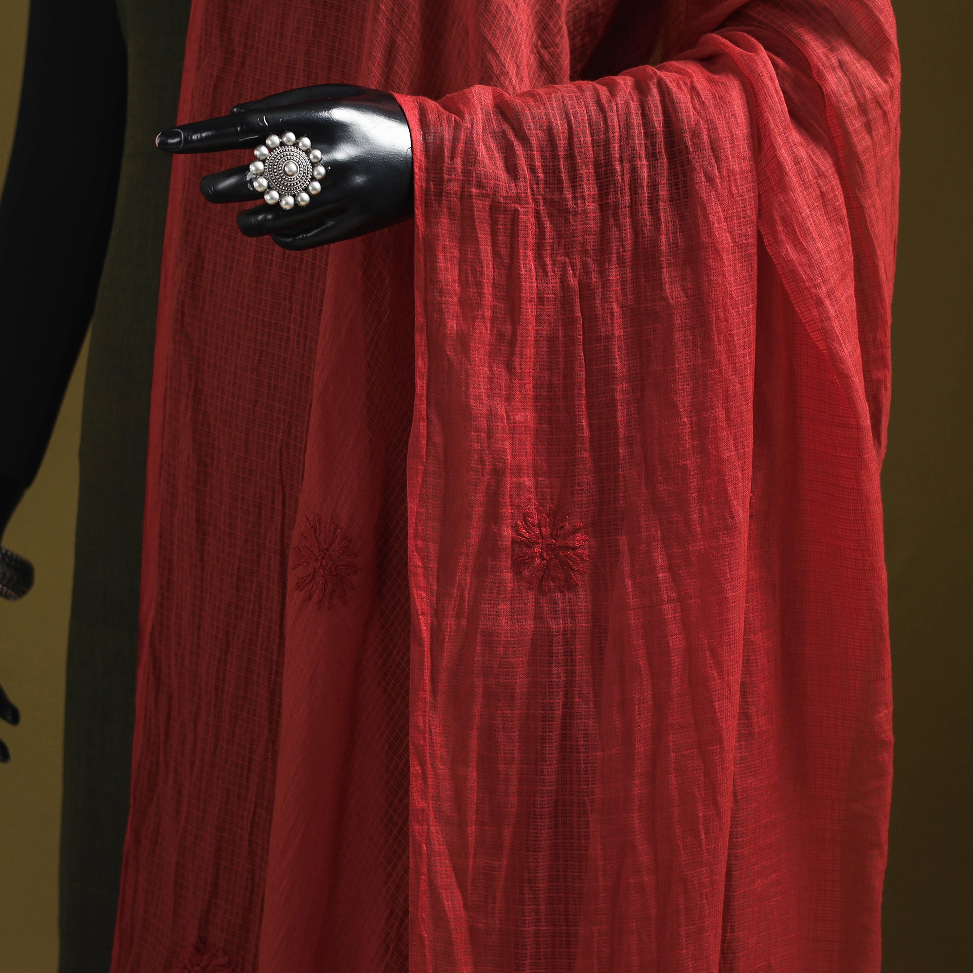 Red - Kota Doria Cotton Hand Embroidered Lucknowi Chikankari Dupatta 07