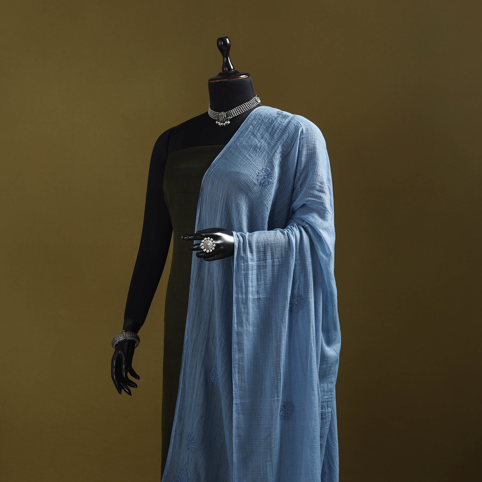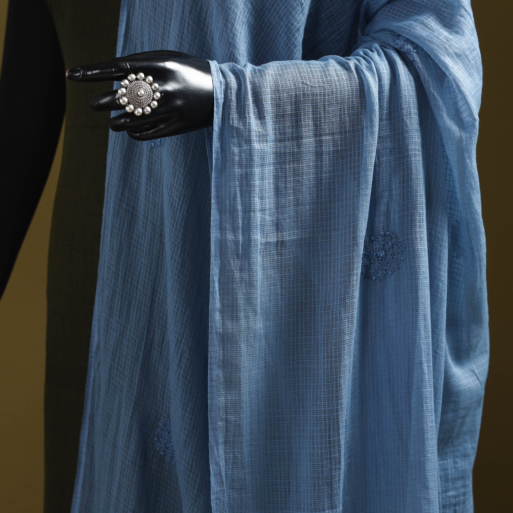 This blue kota doria cotton dupatta showcases exquisite lucknowi chikankari embroidery, crafted by the skilled artisans of Lucknow. The airy, lightweight weave of Kota fabric drapes effortlessly, while the delicate handwork adds timeless elegance. Ideal for festive gatherings, office wear, casual outings, or family occasions, this dupatta beautifully balances comfort with tradition, making it a versatile and graceful choice for every wardrobe.