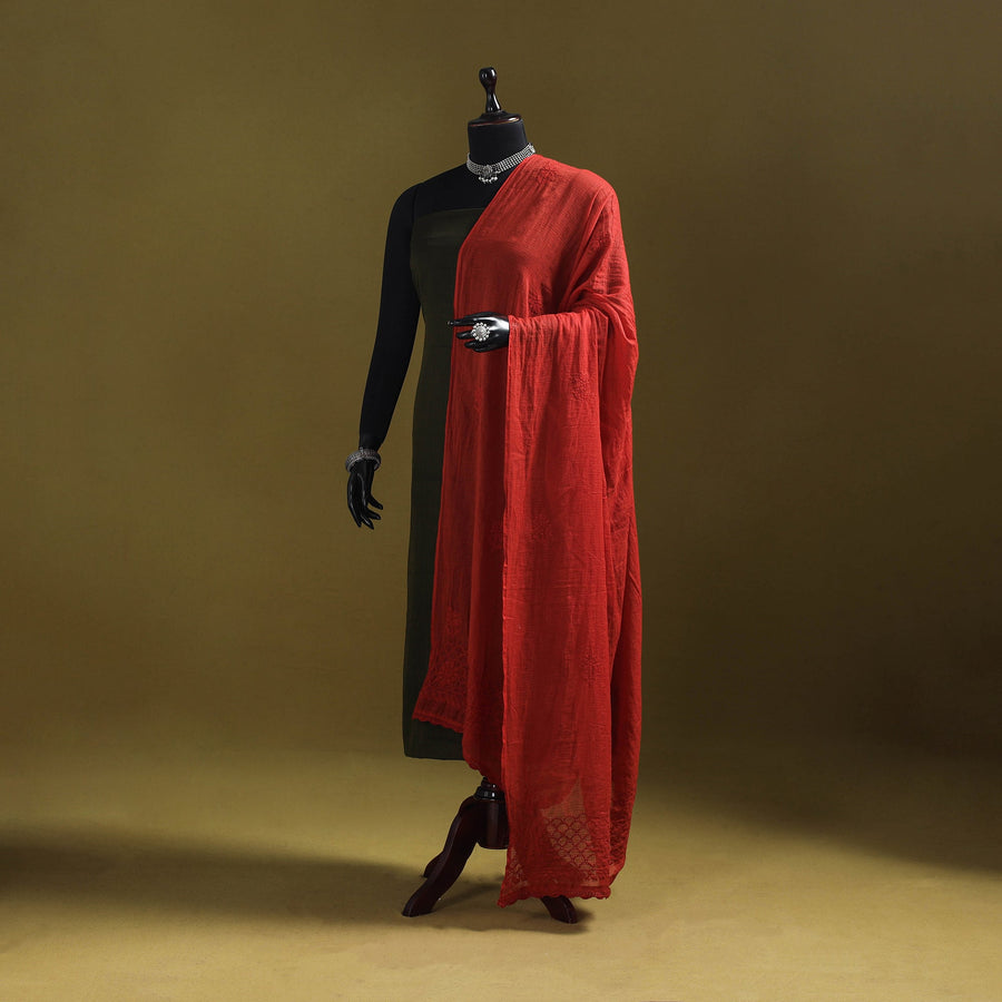 This red kota doria cotton dupatta showcases exquisite lucknowi chikankari embroidery, crafted by the skilled artisans of Lucknow. The airy, lightweight weave of Kota fabric drapes effortlessly, while the delicate handwork adds timeless elegance. Ideal for festive gatherings, office wear, casual outings, or family occasions, this dupatta beautifully balances comfort with tradition, making it a versatile and graceful choice for every wardrobe.