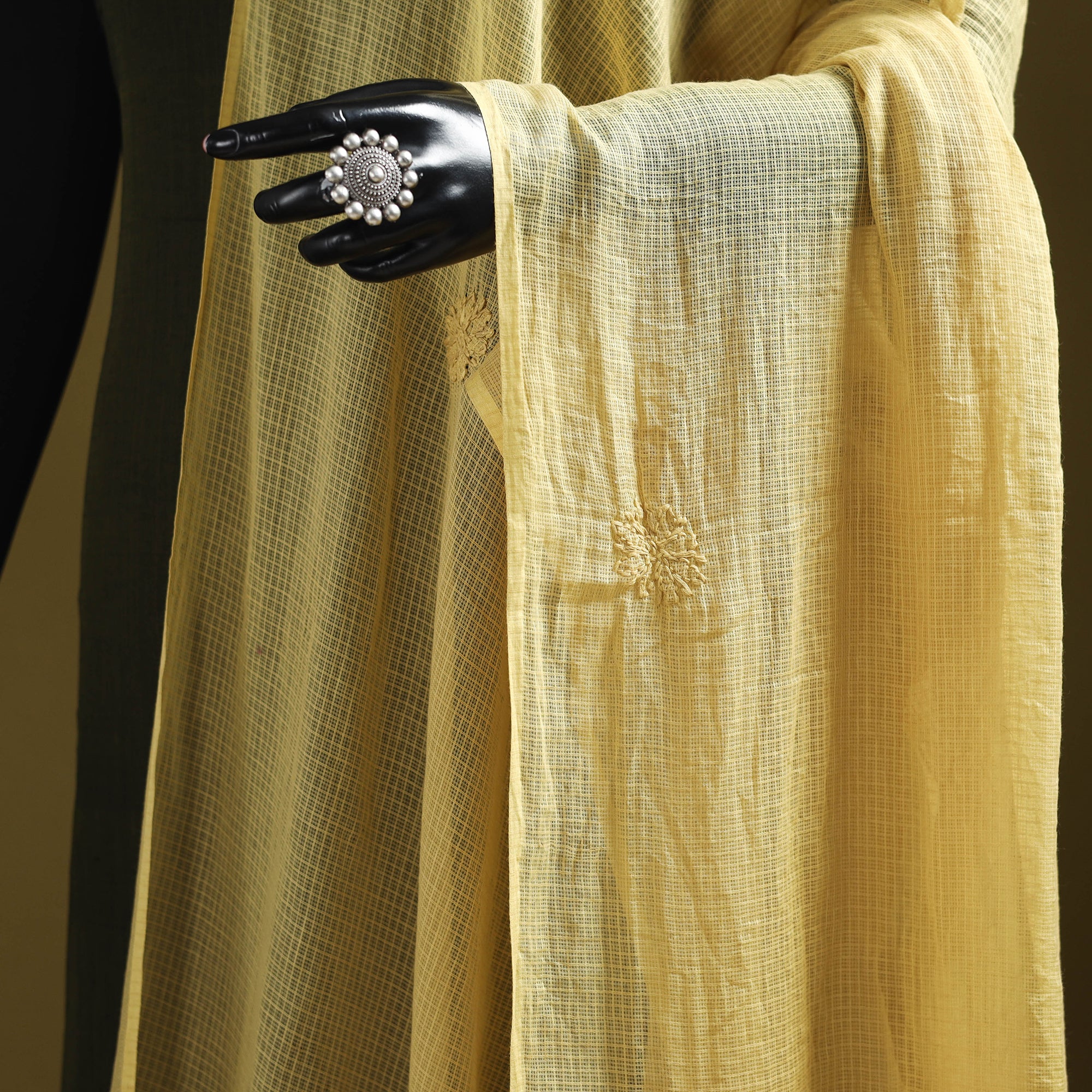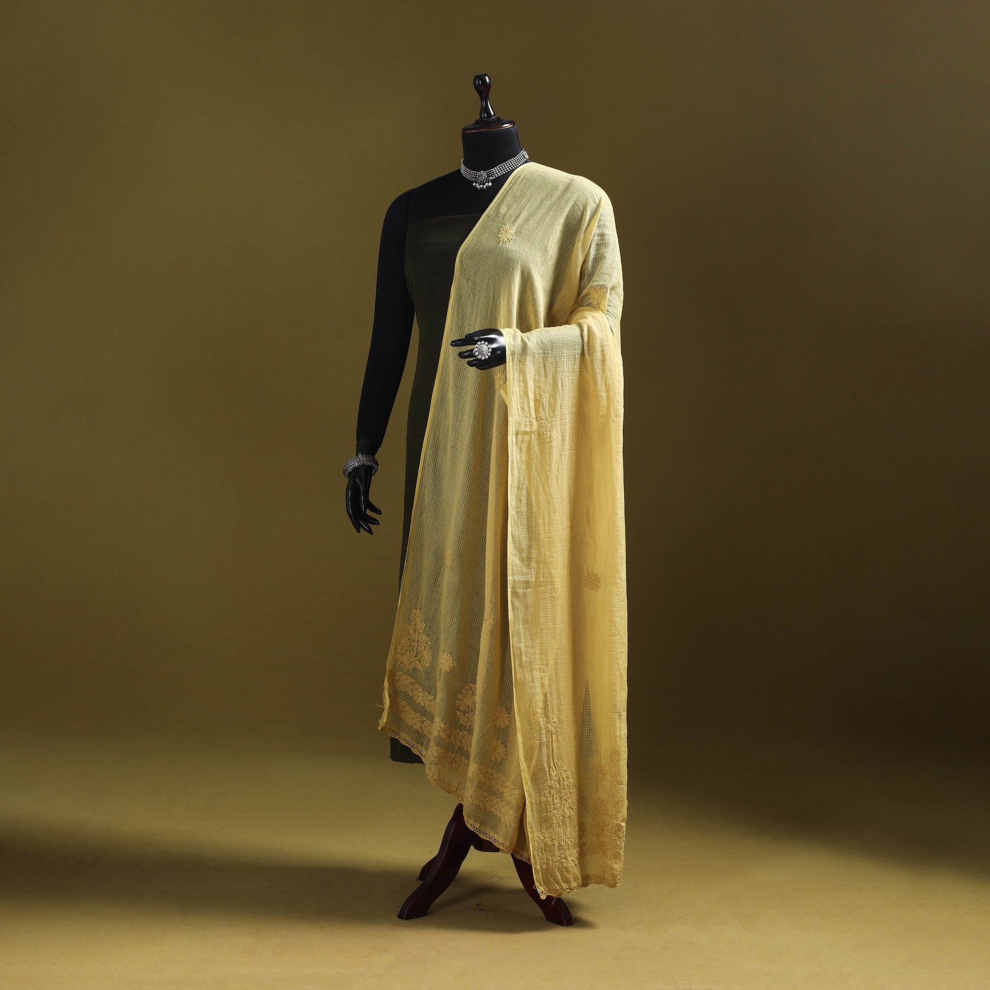 This yellow kota doria cotton dupatta showcases exquisite lucknowi chikankari embroidery, crafted by the skilled artisans of Lucknow. The airy, lightweight weave of Kota fabric drapes effortlessly, while the delicate handwork adds timeless elegance. Ideal for festive gatherings, office wear, casual outings, or family occasions, this dupatta beautifully balances comfort with tradition, making it a versatile and graceful choice for every wardrobe.