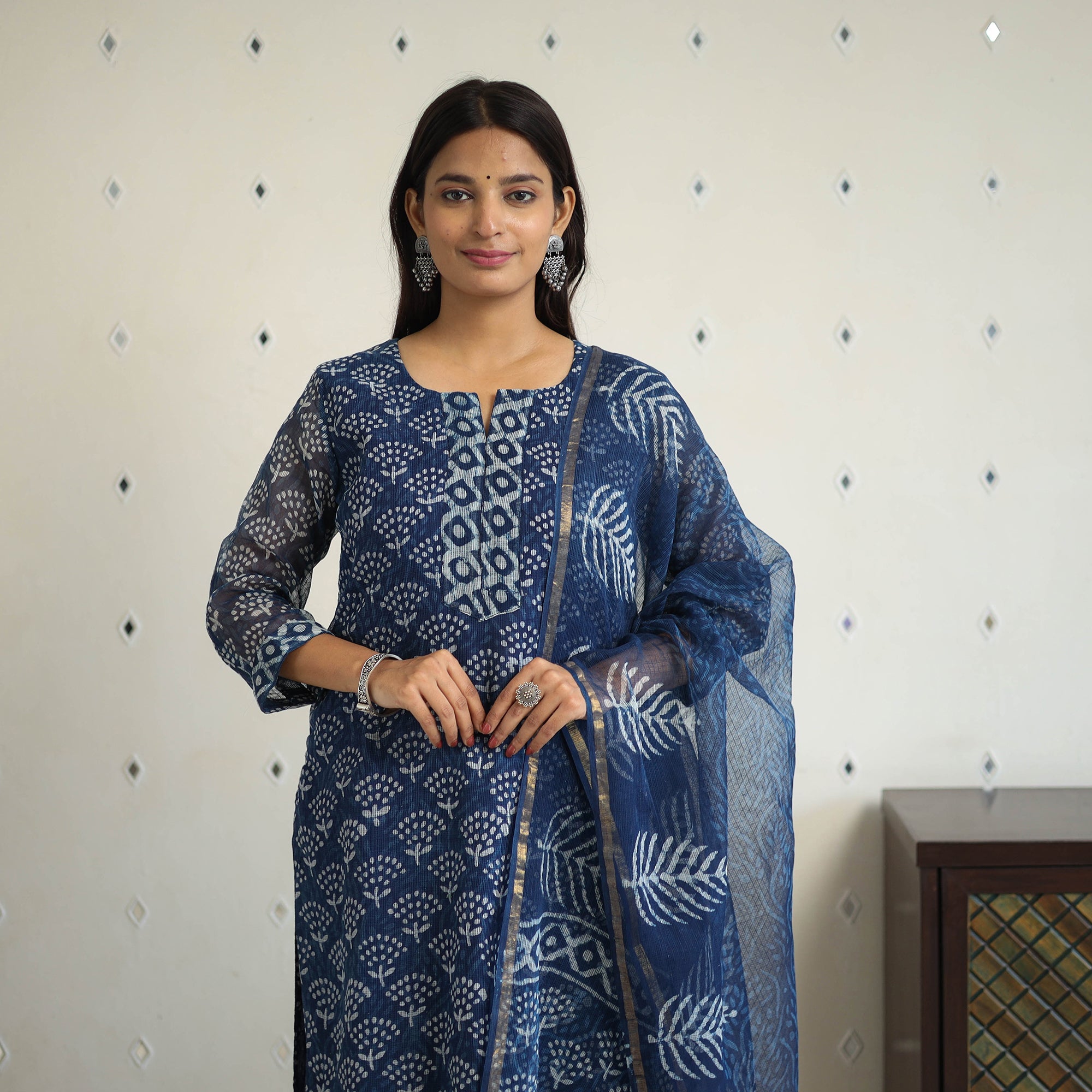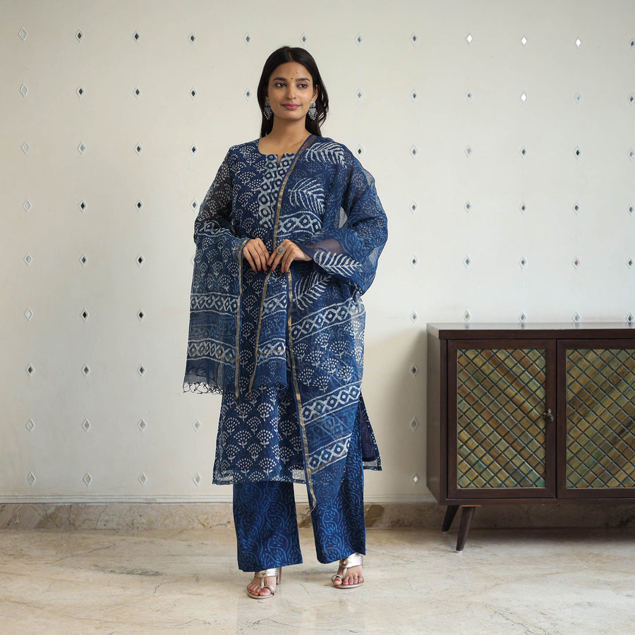 This kota doria cotton indigo bagru block print kurta set features a breezy kurta with a practical side pocket and a matching palazzo with two pockets. The kurta fabric and dupatta are crafted from airy kota doria, a lightweight cotton-silk blend, while the bottom is tailored from soft cotton for everyday comfort. Designed for ease and elegance, it’s an ideal choice for casual outings or festive occasions.