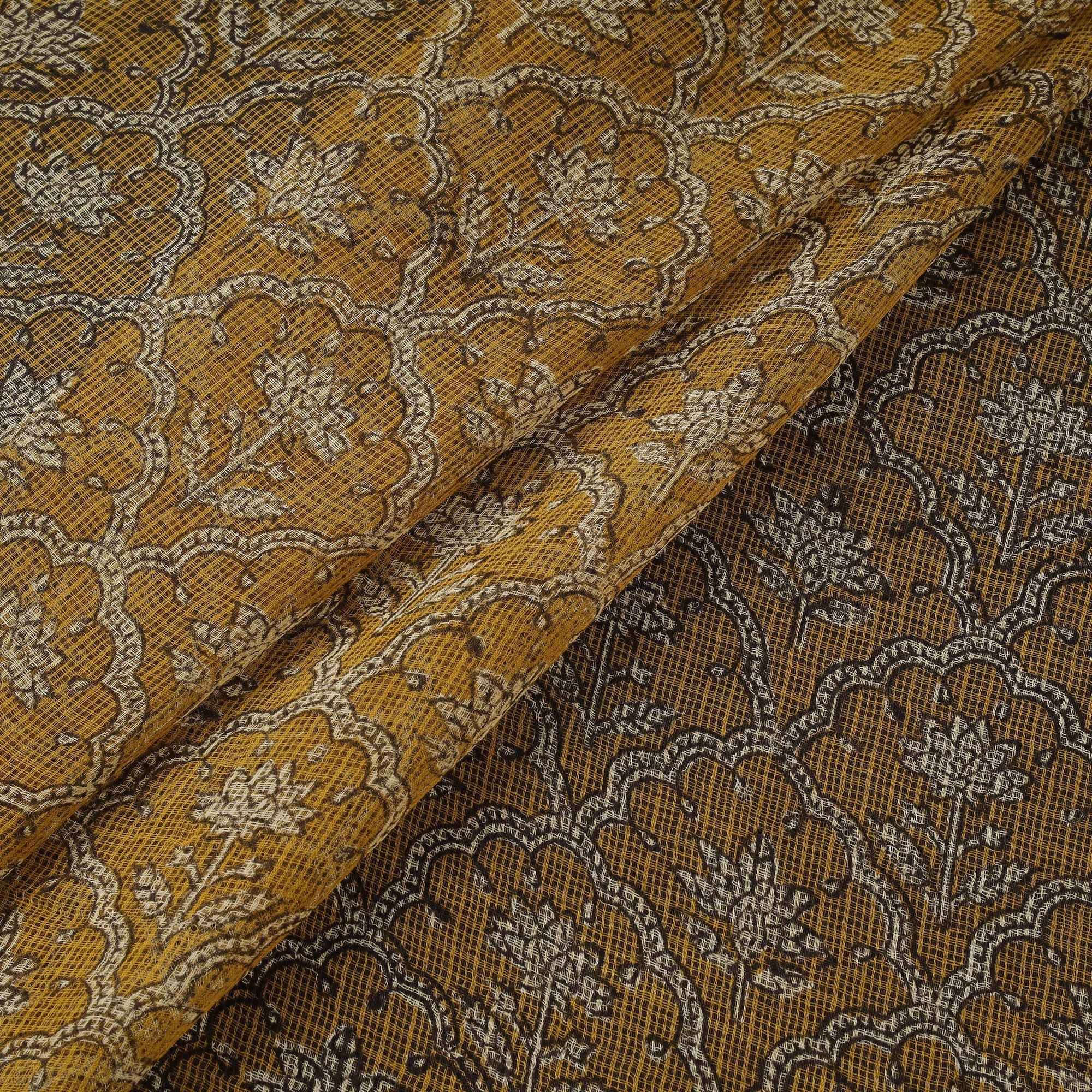Hand block bagru print kota doria cotton fabric comes from the village of Bagru in Rajasthan, where artisans have practiced the mud-resist printing technique for over 400–450 years. The fabric is created by applying a hand-prepared mud resist using carved wooden blocks, followed by dyeing with natural colours. After dyeing, the resist is washed away to reveal distinct patterns. Kota doria is an age-old Indian textile produced in the Kota district of Rajasthan. The fine threads are intricately interwoven to create its characteristic check patterns. Its lightweight and sheer texture give it a grace and elegance of its own. This fabric is suitable for sarees, suits, dupattas, kurtas, dresses and stoles.