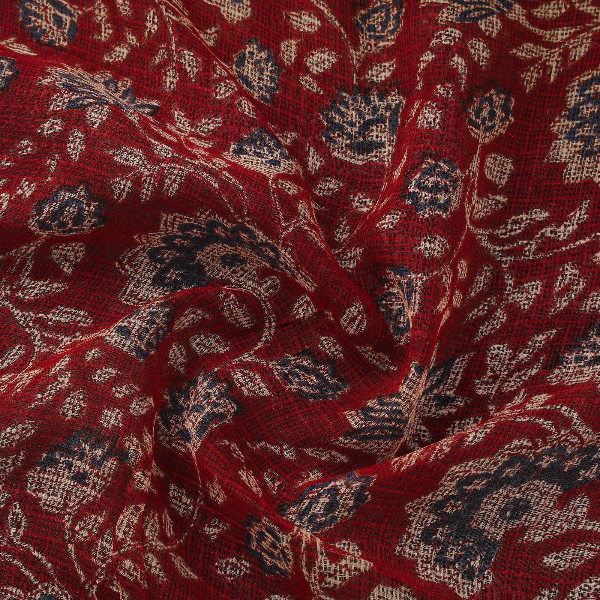 Hand block bagru print kota doria cotton fabric comes from the village of Bagru in Rajasthan, where artisans have practiced the mud-resist printing technique for over 400–450 years. The fabric is created by applying a hand-prepared mud resist using carved wooden blocks, followed by dyeing with natural colours. After dyeing, the resist is washed away to reveal distinct patterns. Kota doria is an age-old Indian textile produced in the Kota district of Rajasthan. The fine threads are intricately interwoven to create its characteristic check patterns. Its lightweight and sheer texture give it a grace and elegance of its own. This fabric is suitable for sarees, suits, dupattas, kurtas, dresses and stoles.