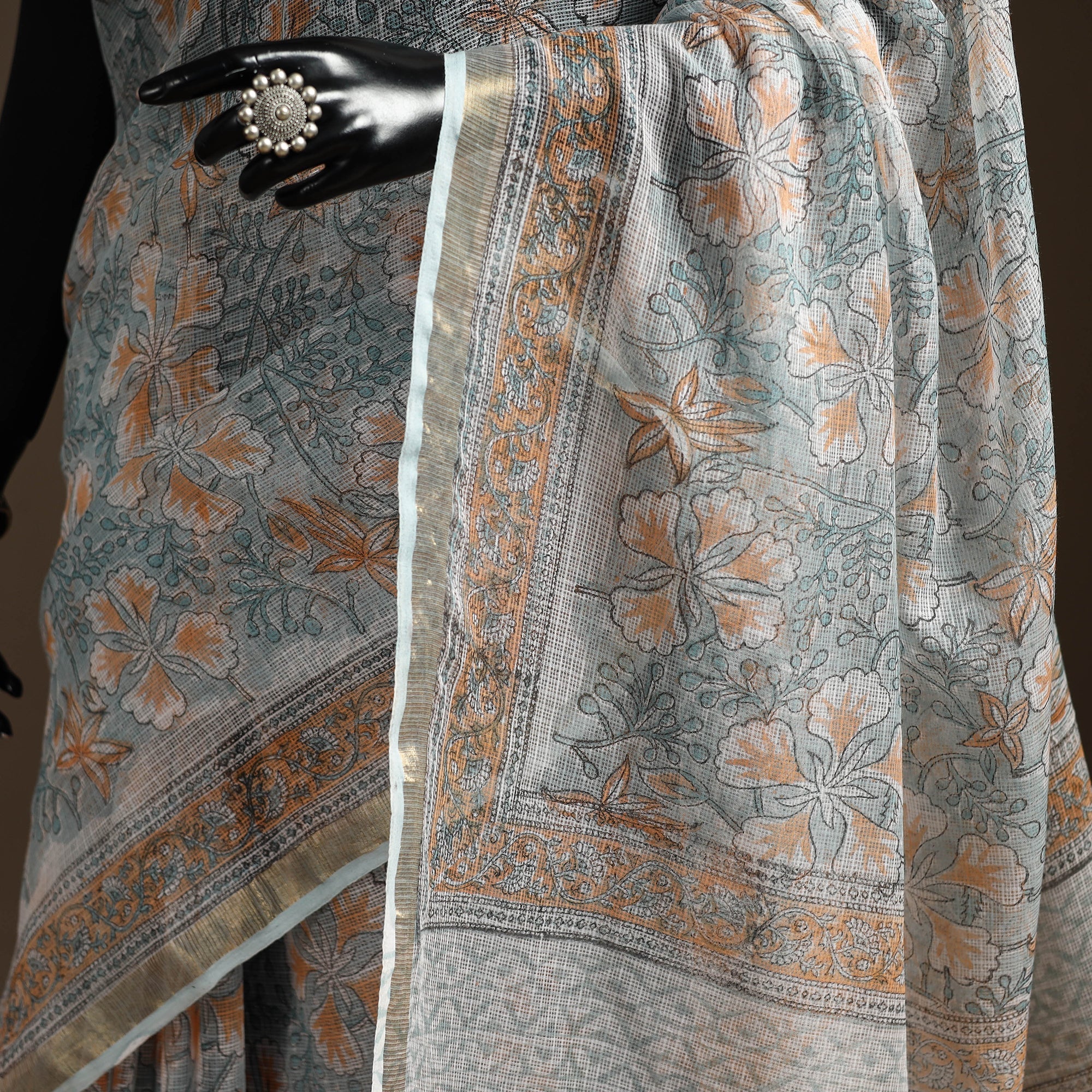 Blue - Kota Doria Cotton Sanganeri Print Saree 11