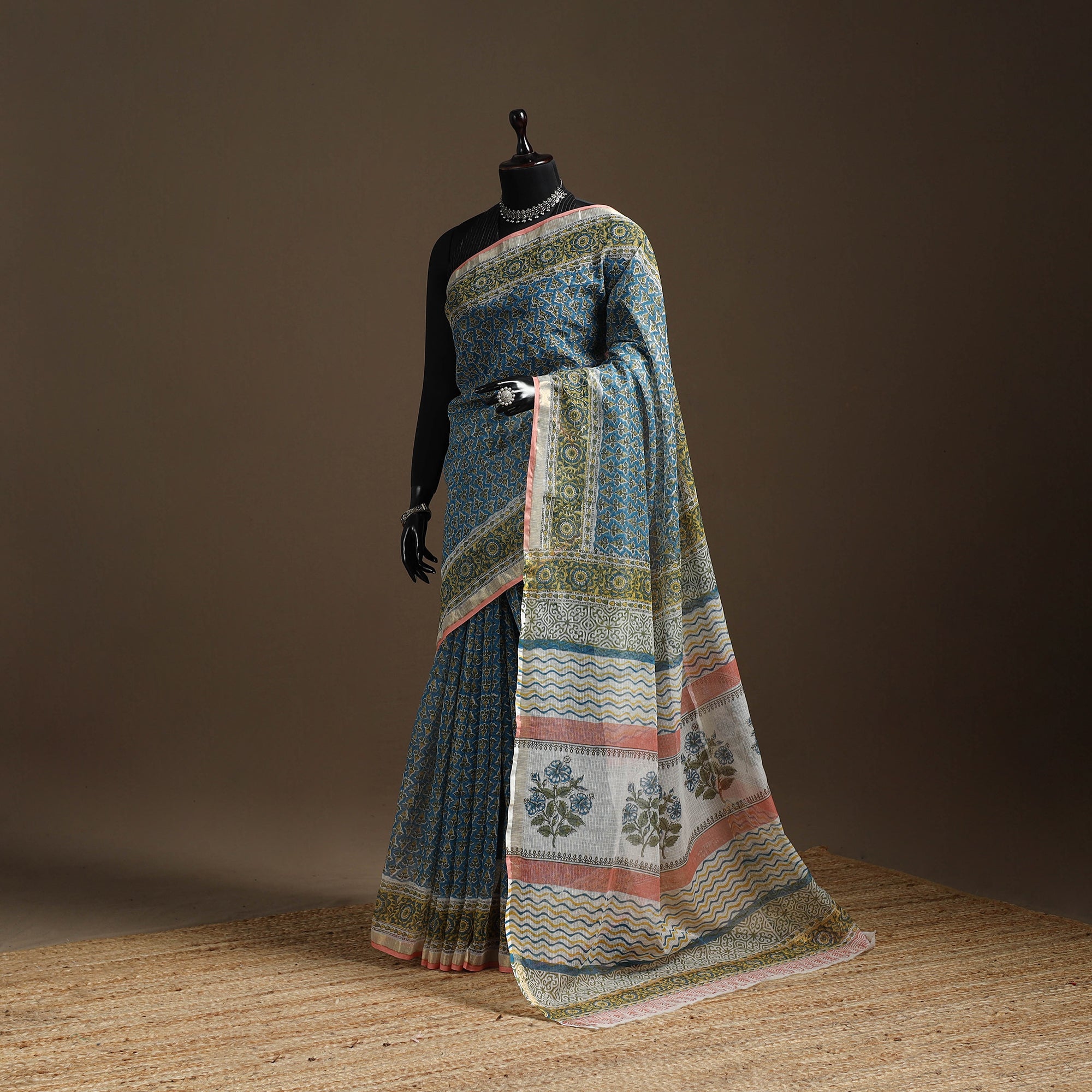 This blue sanganeri print saree features kota doria fabric a blend of cotton and silk, hand-block printed by artisans using the traditional sanganeri technique from Rajasthan. Kota Doria combines strong cotton and silk yarns, finely woven into check patterns, giving it a lightweight and sheer texture. The saree is enhanced with a zari border, making it perfect for everyday elegance or a festive look.