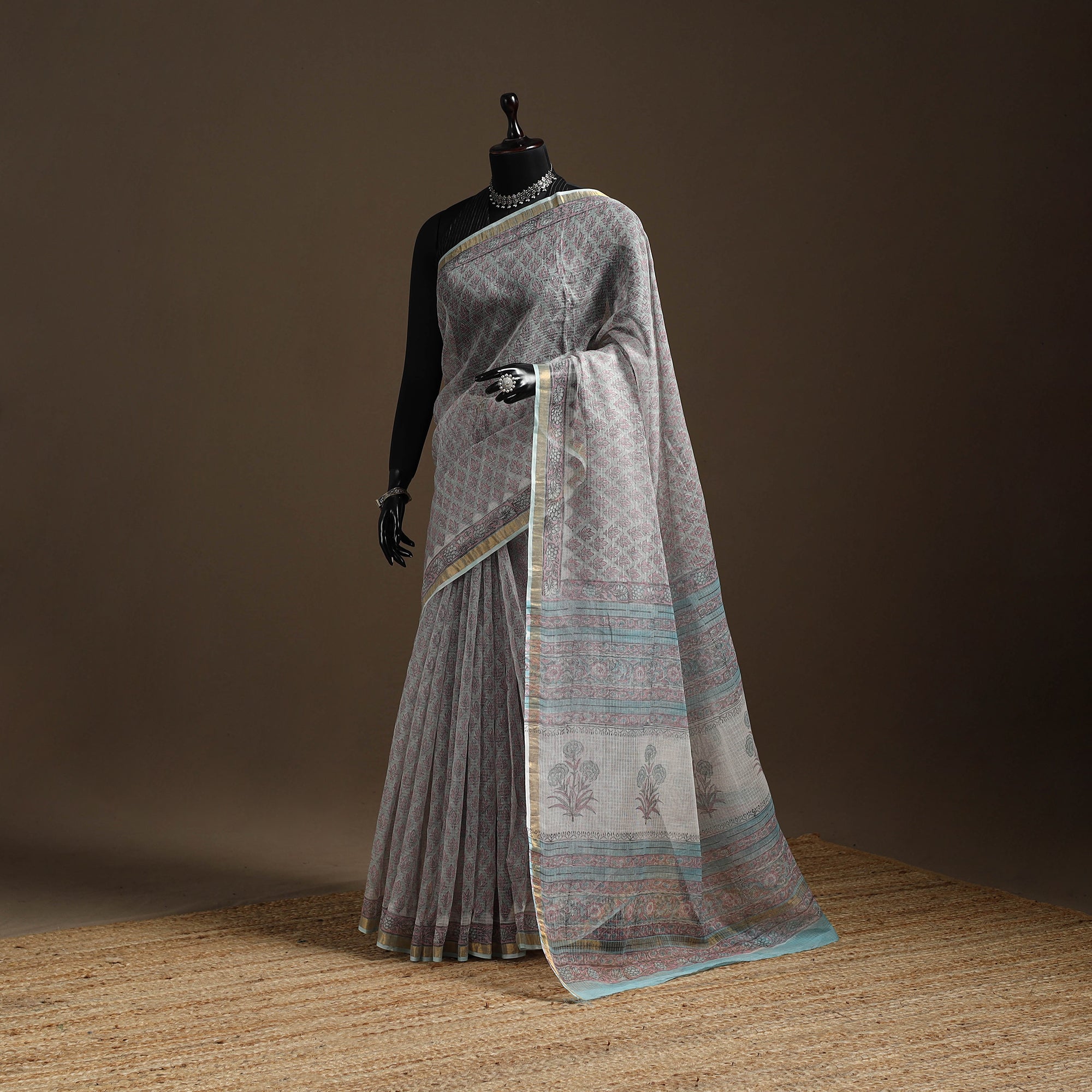 This sanganeri print saree features kota doria fabric a blend of cotton and silk, hand-block printed by artisans using the traditional sanganeri technique from Rajasthan. Kota Doria combines strong cotton and silk yarns, finely woven into check patterns, giving it a lightweight and sheer texture. The saree is enhanced with a zari border, making it perfect for everyday elegance or a festive look.