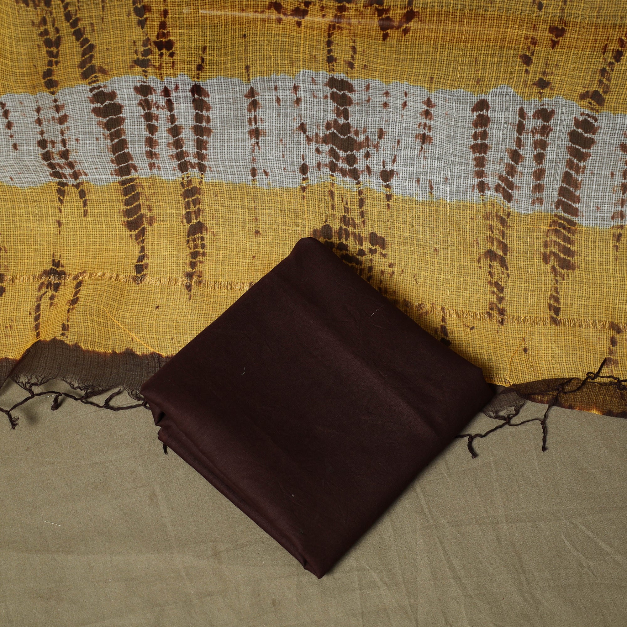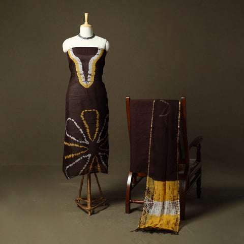 Shibori kota doria cotton 3pc unstitched dress material set blends traditional artistry with everyday comfort. Hand-dyed using the 1,300 year old shibori tie-dye technique, the fabric is carefully bound with threads to create intricate and distinctive patterns. Crafted by skilled artisans from Rajasthan, the kurta fabric and dupatta are made from airy kota doria, an age-old textile from the Kota district known for its finely interwoven check patterns and sheer, lightweight texture. The soft cotton bottom ensures ease throughout the day, making this set ideal for both daily wear and occasions.