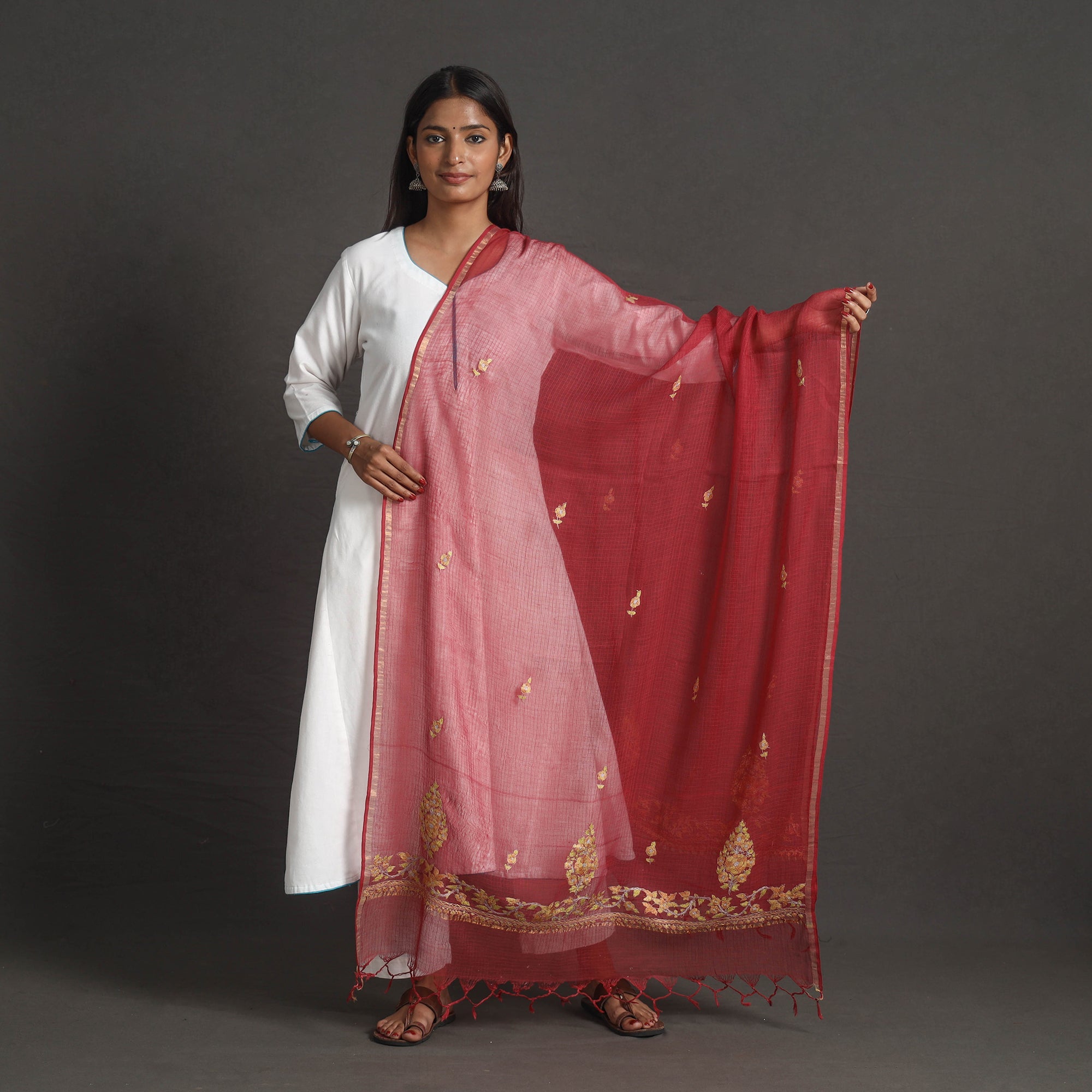 Experience the beauty of Kashmir with our red kota doria silk cotton Kashida embroidery dupatta, crafted by Zahoor Ahmed. Kashida embroidery is one of the most ancient and traditional types of craft. It is also known as ‘Kasida’. The embroidery is done with multi-colored threads. This delicate and traditional form of art is done by the young men of Kashmir. With an elegant zari border and lightweight texture, it’s perfect for any occasion. Embrace traditional craftsmanship and support local artisans.