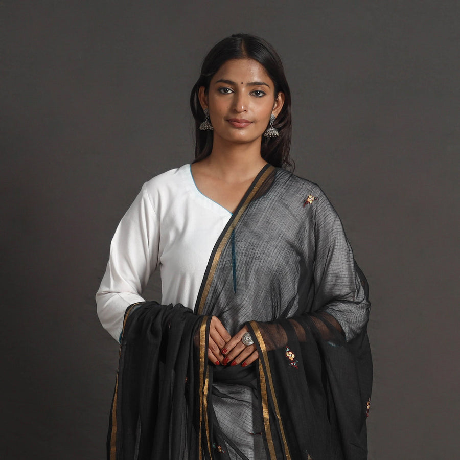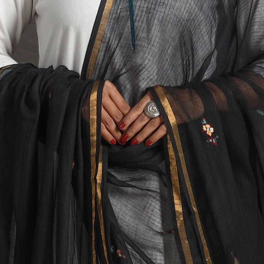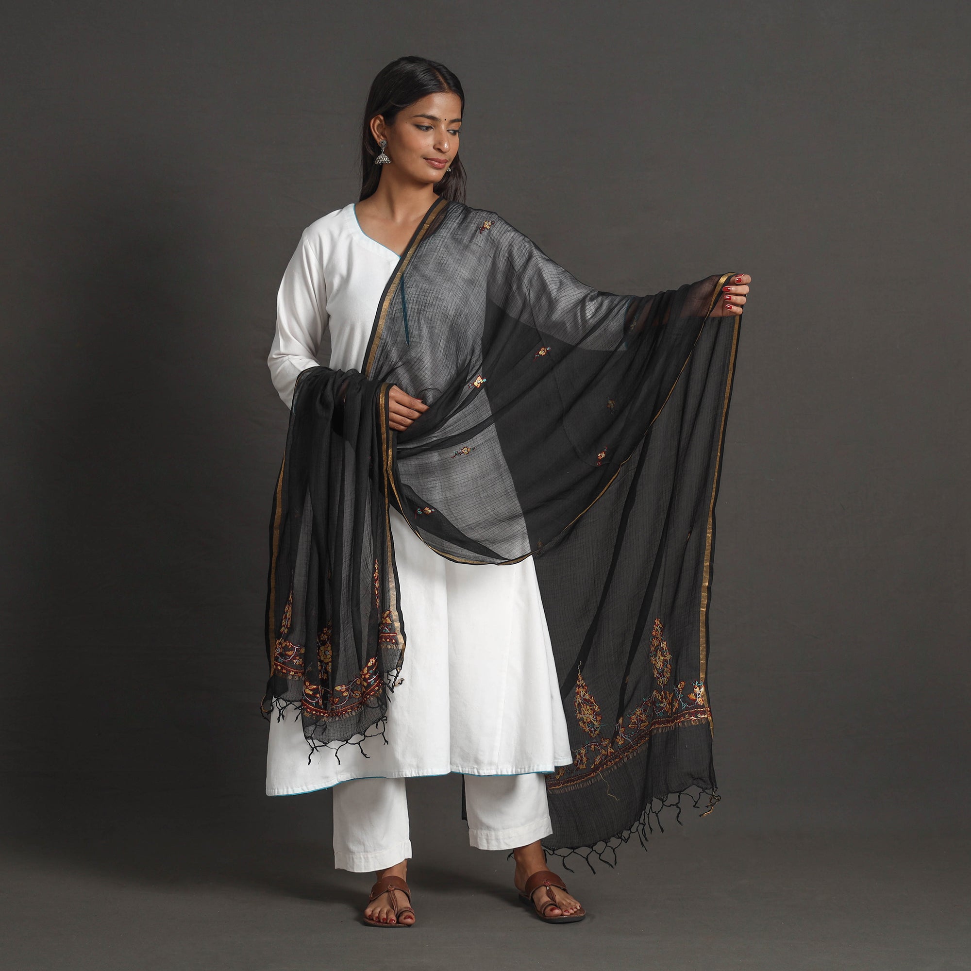 Experience the beauty of Kashmir with our black kota doria silk cotton Kashida embroidery dupatta, crafted by Zahoor Ahmed. Kashida embroidery is one of the most ancient and traditional types of craft. It is also known as ‘Kasida’. The embroidery is done with multi-colored threads. This delicate and traditional form of art is done by the young men of Kashmir. With an elegant zari border and lightweight texture, it’s perfect for any occasion. Embrace traditional craftsmanship and support local artisans.