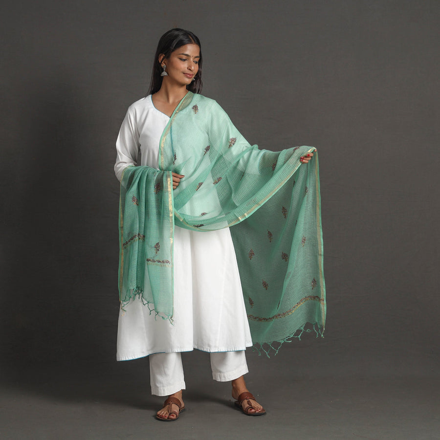 Experience the beauty of Kashmir with our green kota doria silk cotton Kashida embroidery dupatta, crafted by Zahoor Ahmed. Kashida embroidery is one of the most ancient and traditional types of craft. It is also known as ‘Kasida’. The embroidery is done with multi-colored threads. This delicate and traditional form of art is done by the young men of Kashmir. With an elegant zari border and lightweight texture, it’s perfect for any occasion. Embrace traditional craftsmanship and support local artisans.