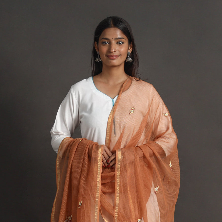 Experience the beauty of Kashmir with our brown kota doria silk cotton Kashida embroidery dupatta, crafted by Zahoor Ahmed. Kashida embroidery is one of the most ancient and traditional types of craft. It is also known as ‘Kasida’. The embroidery is done with multi-colored threads. This delicate and traditional form of art is done by the young men of Kashmir. With an elegant zari border and lightweight texture, it’s perfect for any occasion. Embrace traditional craftsmanship and support local artisans.