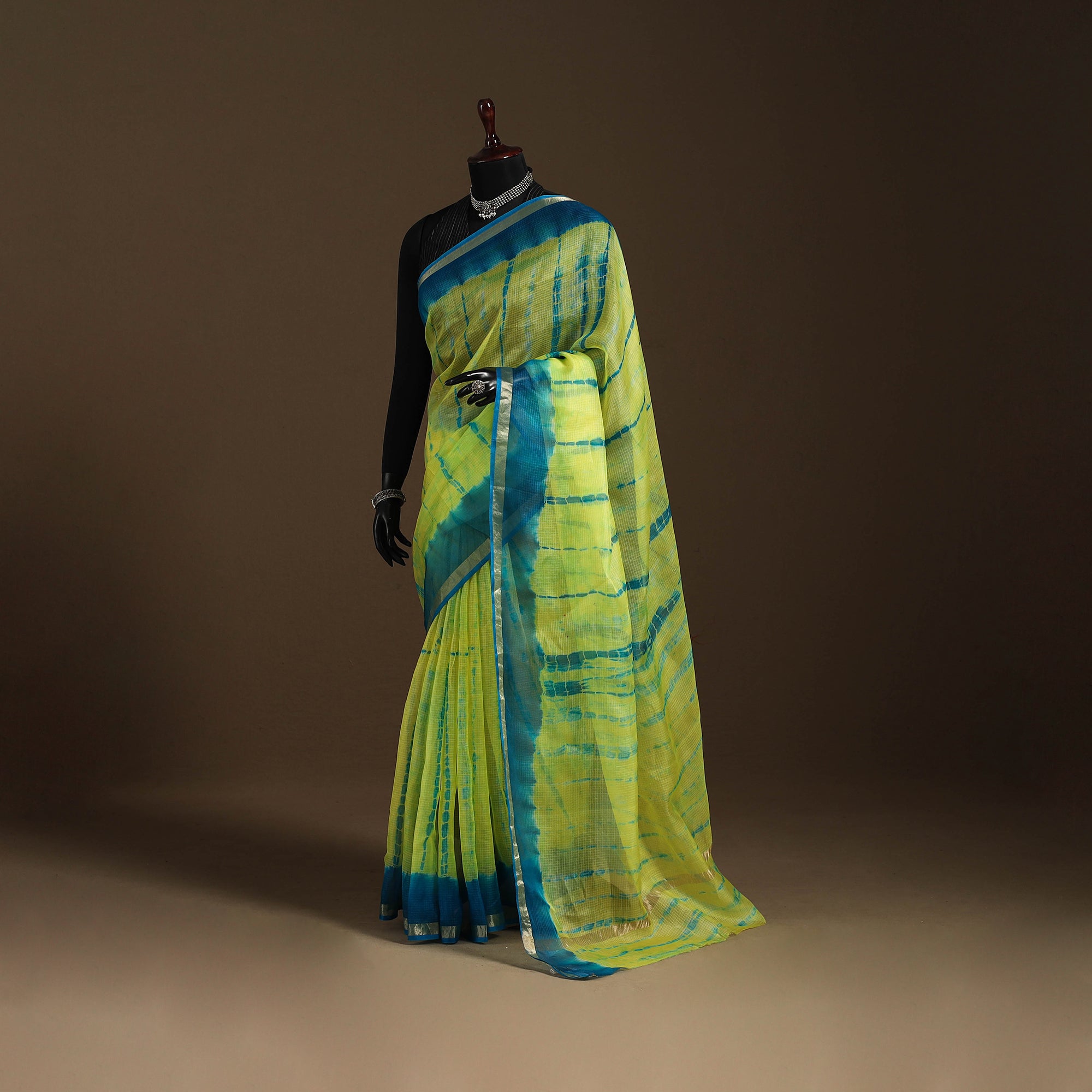 This yellow kota doria silk saree with a zari border is crafted using traditional shibori tie-dye techniques, where the fabric is bound with stitches or clamps to form distinctive patterns. Woven in Rajasthan, kota doria is a fine cotton-silk blend valued for its airy texture and sheer elegance. Light, breathable, and graceful to drape, this saree is ideal for everyday sophistication as well as festive occasions.