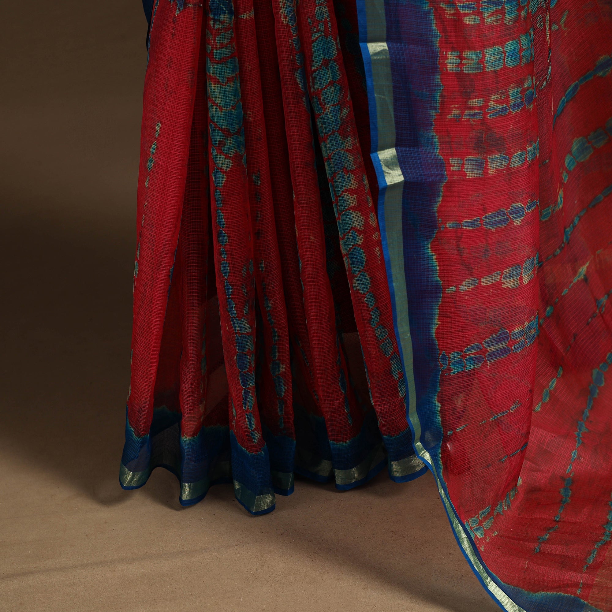 This red kota doria silk saree with a zari border is crafted using traditional shibori tie-dye techniques, where the fabric is bound with stitches or clamps to form distinctive patterns. Woven in Rajasthan, kota doria is a fine cotton-silk blend valued for its airy texture and sheer elegance. Light, breathable, and graceful to drape, this saree is ideal for everyday sophistication as well as festive occasions.