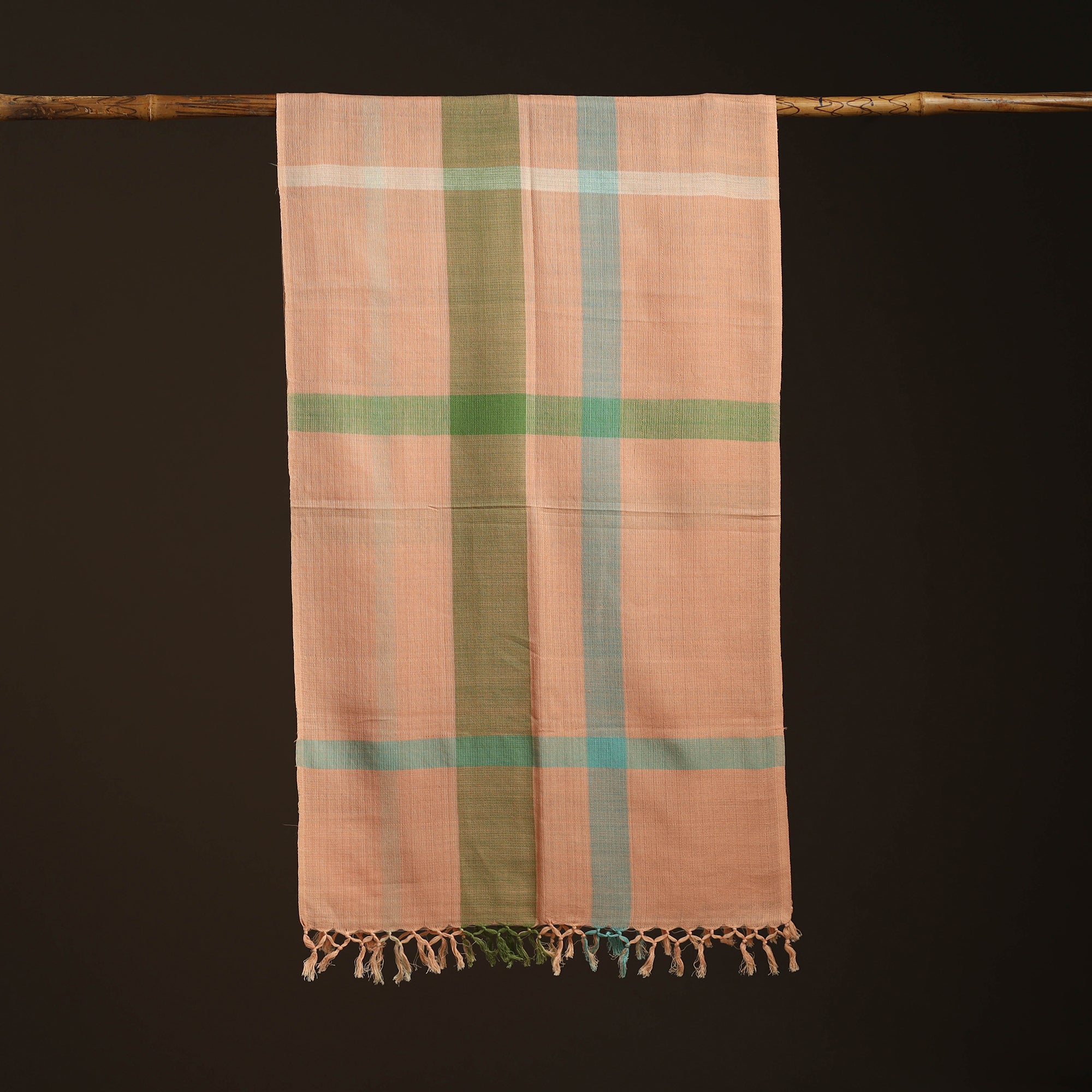 Wrap yourself in elegance with this peach kumaon handwoven merino wool and cotton stole, meticulously crafted by skilled artisans in Uttarakhand. Blending merino wool with cotton, this stole offers exceptional softness and comfort while reflecting the rich heritage of handwoven textiles. Its smooth feel and versatile design make it perfect for everyday wear or special occasions.