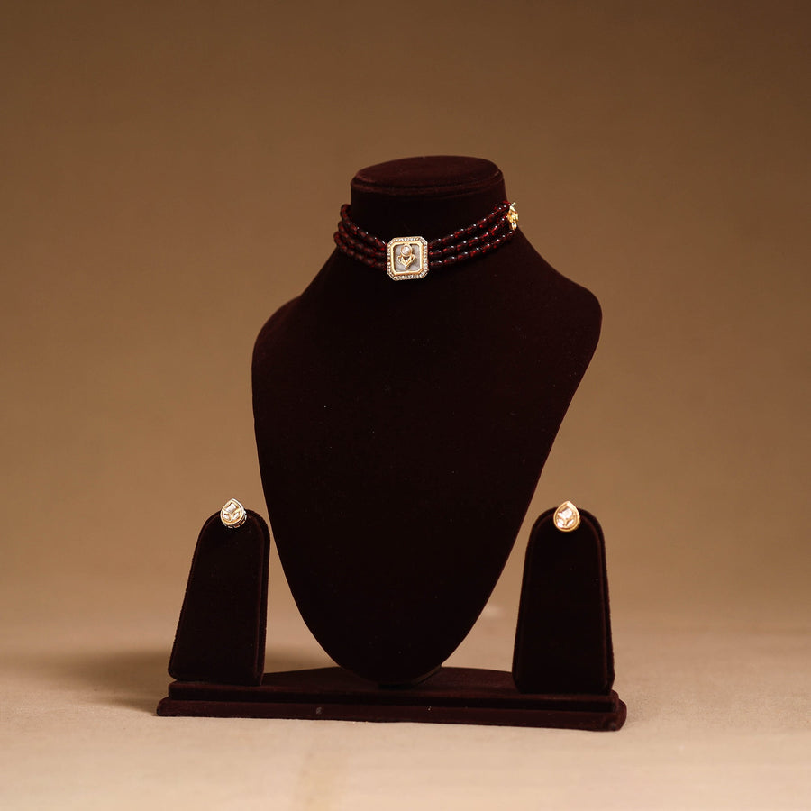 Handmade choker necklace set featuring kundan work on a brass metal base. Brass is a corrosion-resistant alloy, allowing it to maintain its appearance even with regular use. It comes with matching earrings for a complete look. Created by artisans, this set is suitable for weddings, cultural functions or for adding a unique flair to everyday style.