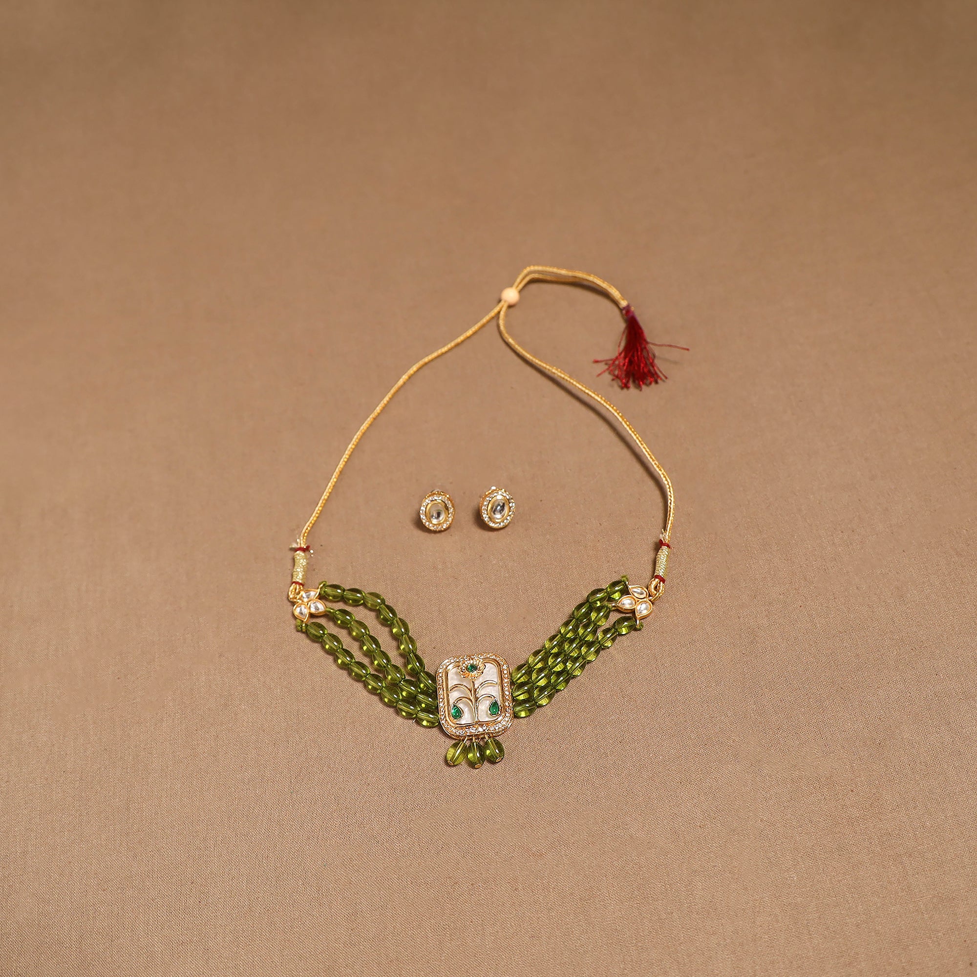 Handmade choker necklace set featuring kundan work on a brass metal base. Brass is a corrosion-resistant alloy, allowing it to maintain its appearance even with regular use. It comes with matching earrings for a complete look. Created by artisans, this set is suitable for weddings, cultural functions or for adding a unique flair to everyday style.