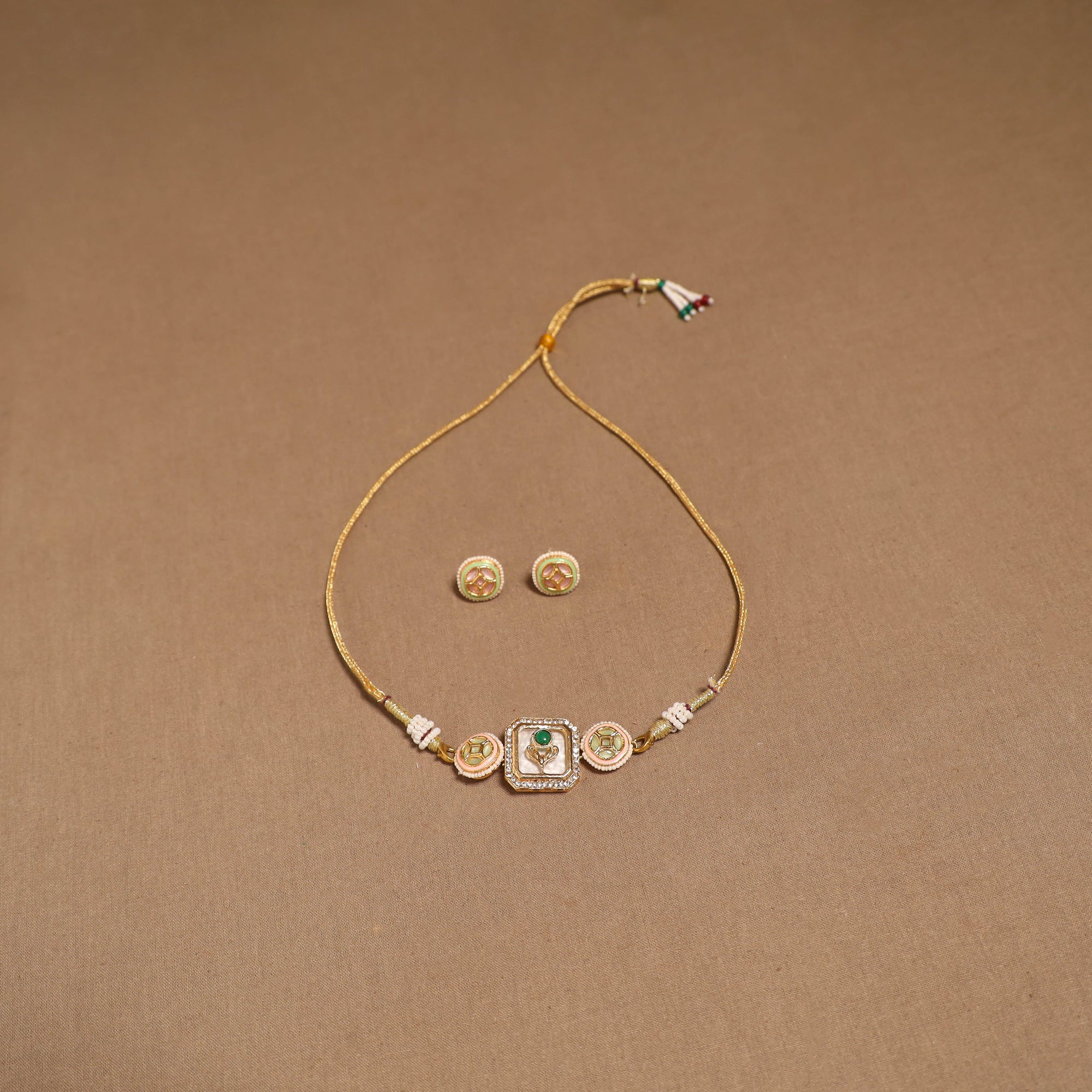 Handmade choker necklace set featuring kundan work on a brass metal base. Brass is a corrosion-resistant alloy, allowing it to maintain its appearance even with regular use. It comes with matching earrings for a complete look. Created by artisans, this set is suitable for weddings, cultural functions or for adding a unique flair to everyday style.