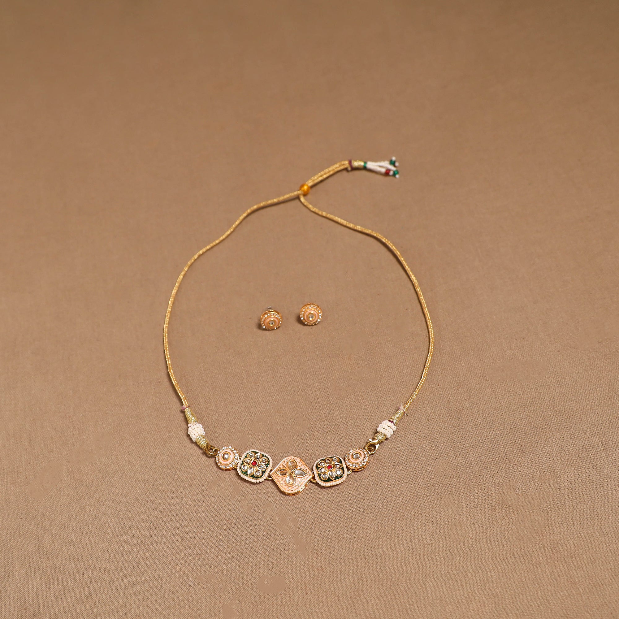 Handmade peach choker necklace set featuring kundan work on a brass metal base. Brass is a corrosion-resistant alloy, allowing it to maintain its appearance even with regular use. It comes with matching earrings for a complete look. Created by artisans, this set is suitable for weddings, cultural functions or for adding a unique flair to everyday style.