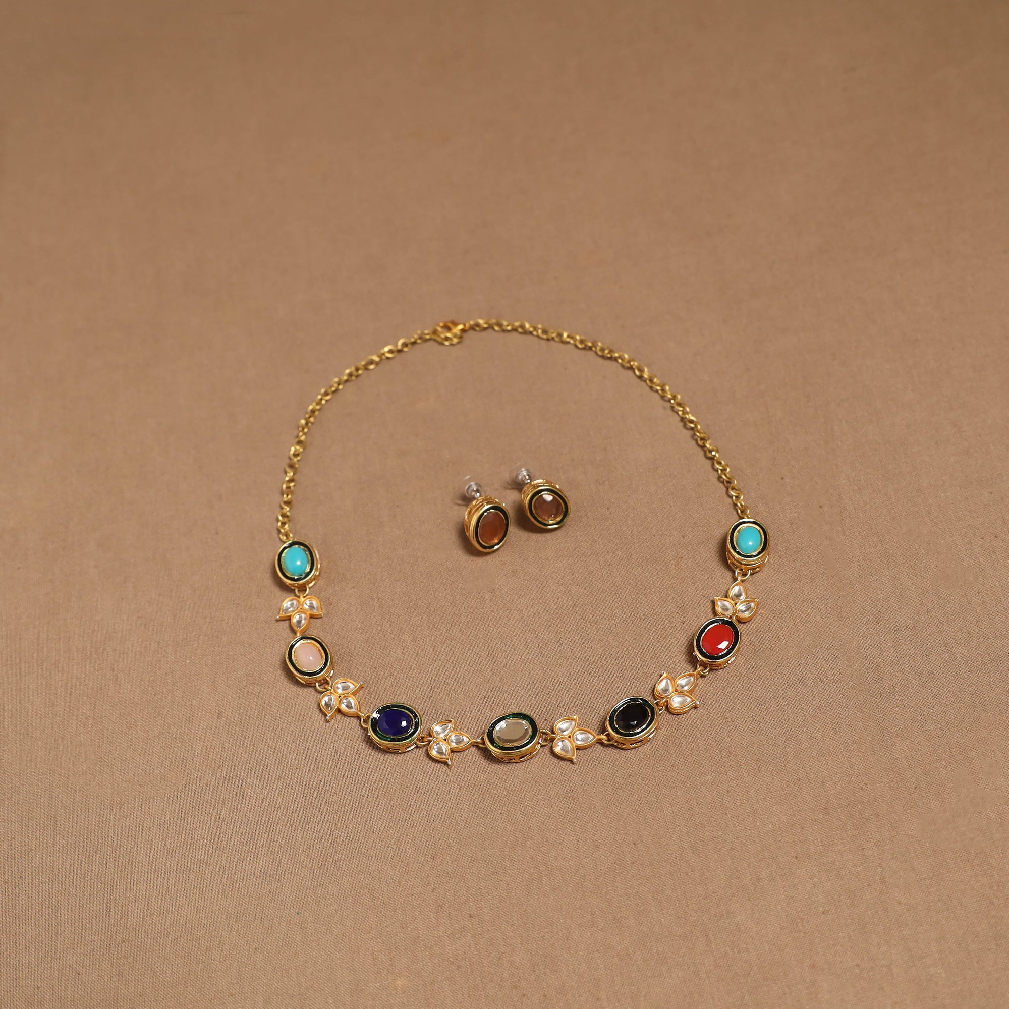 Handmade necklace set featuring kundan work on a brass metal base. Brass is a corrosion-resistant alloy, allowing it to maintain its appearance even with regular use. It comes with matching earrings for a complete look. Created by artisans, this set is suitable for weddings, cultural functions or for adding a unique flair to everyday style.