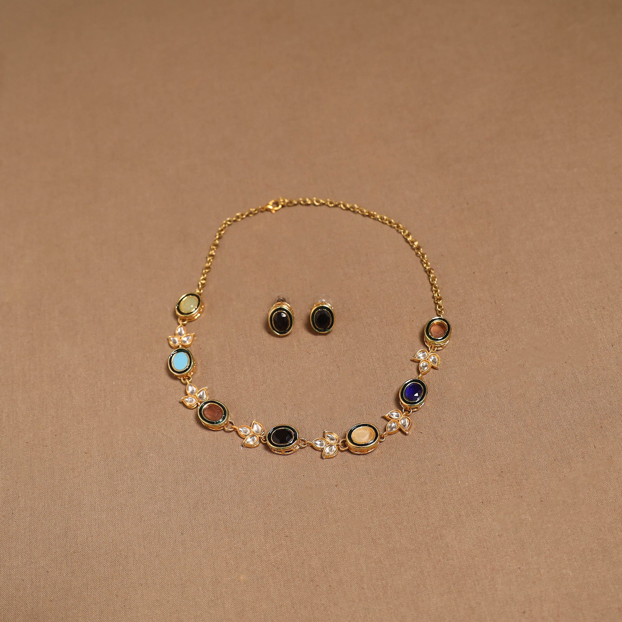 Handmade necklace set featuring kundan work on a brass metal base. Brass is a corrosion-resistant alloy, allowing it to maintain its appearance even with regular use. It comes with matching earrings for a complete look. Created by artisans, this set is suitable for weddings, cultural functions or for adding a unique flair to everyday style.