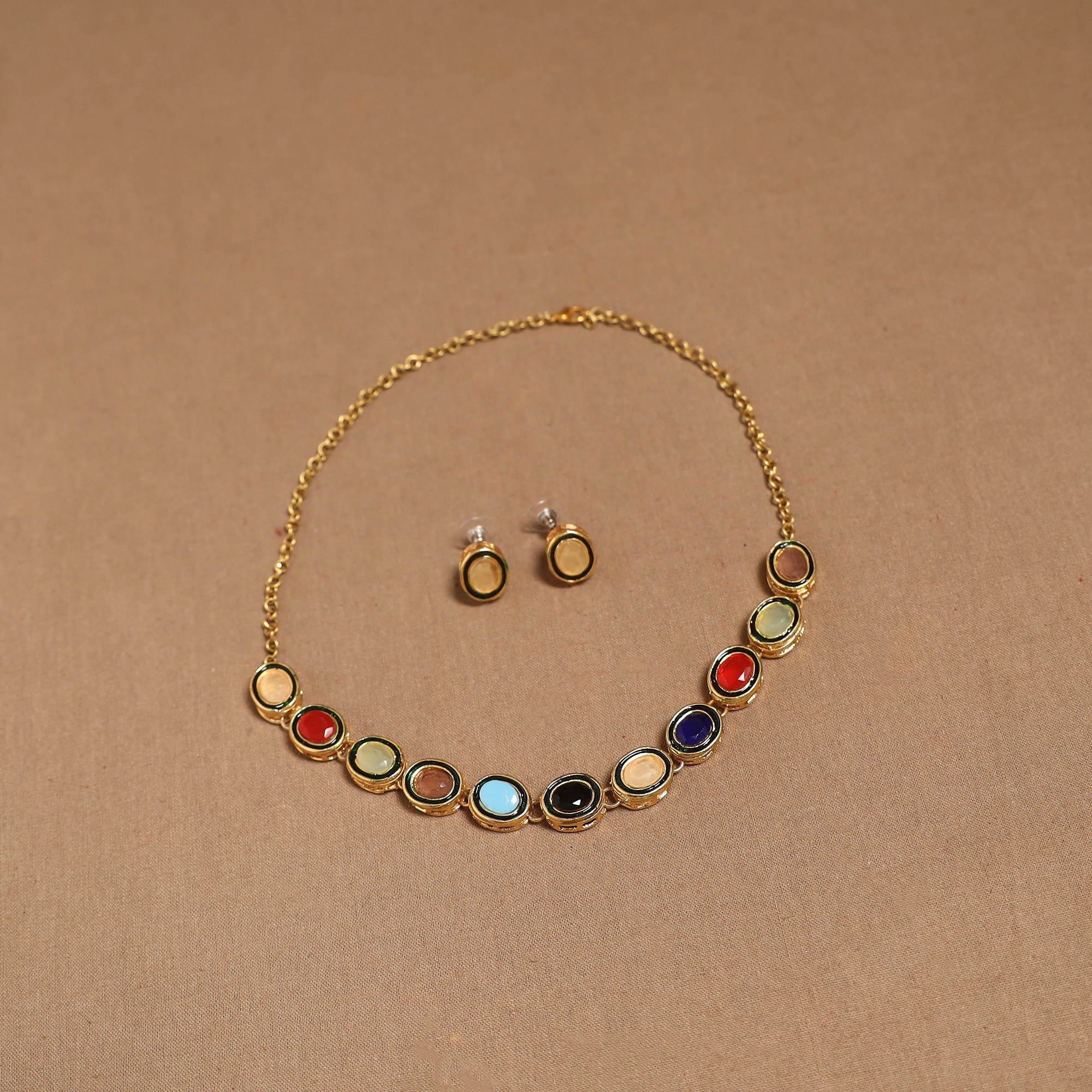 Handmade necklace set featuring kundan work on a brass metal base. Brass is a corrosion-resistant alloy, allowing it to maintain its appearance even with regular use. It comes with matching earrings for a complete look. Created by artisans, this set is suitable for weddings, cultural functions or for adding a unique flair to everyday style.