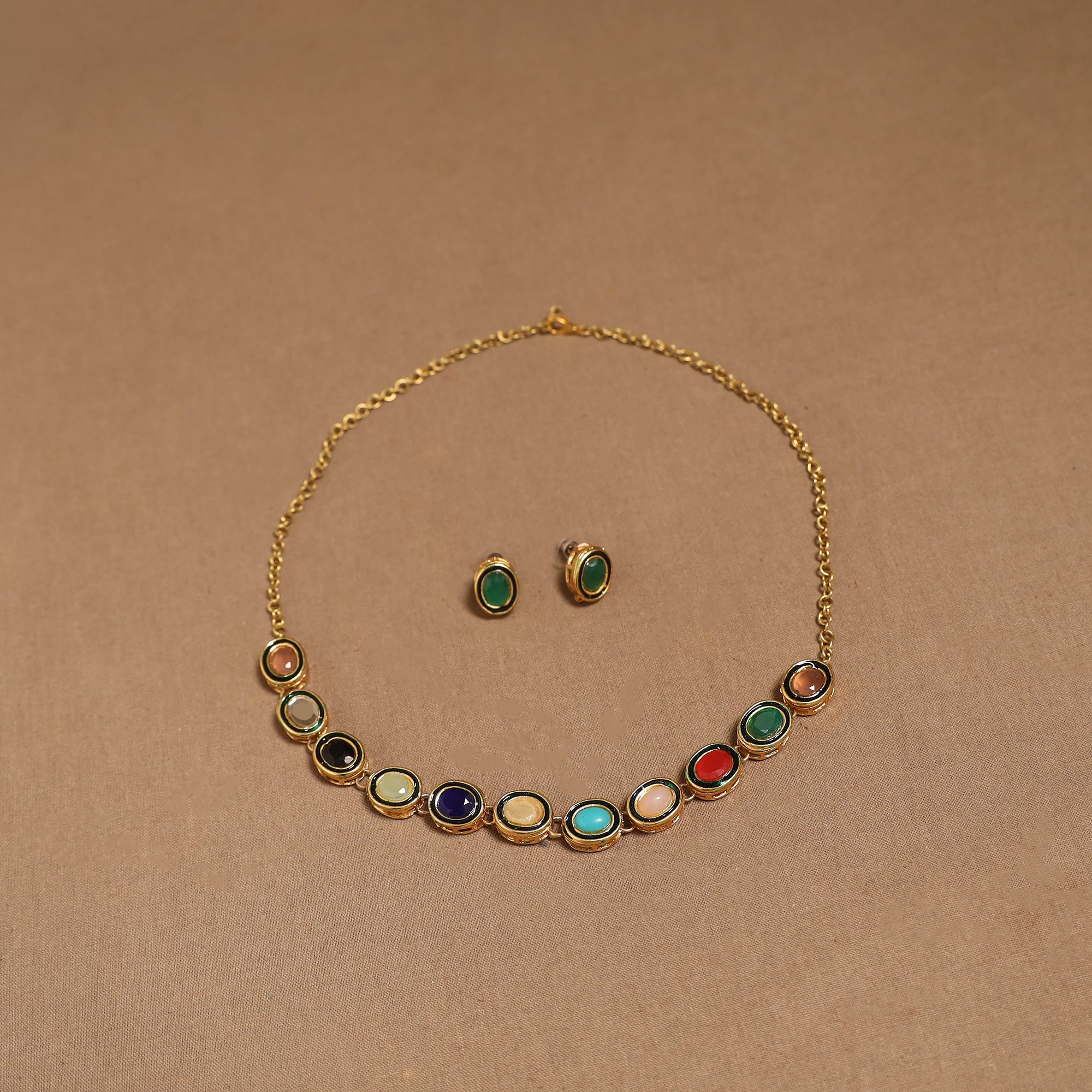 Handmade necklace set featuring kundan work on a brass metal base. Brass is a corrosion-resistant alloy, allowing it to maintain its appearance even with regular use. It comes with matching earrings for a complete look. Created by artisans, this set is suitable for weddings, cultural functions or for adding a unique flair to everyday style.