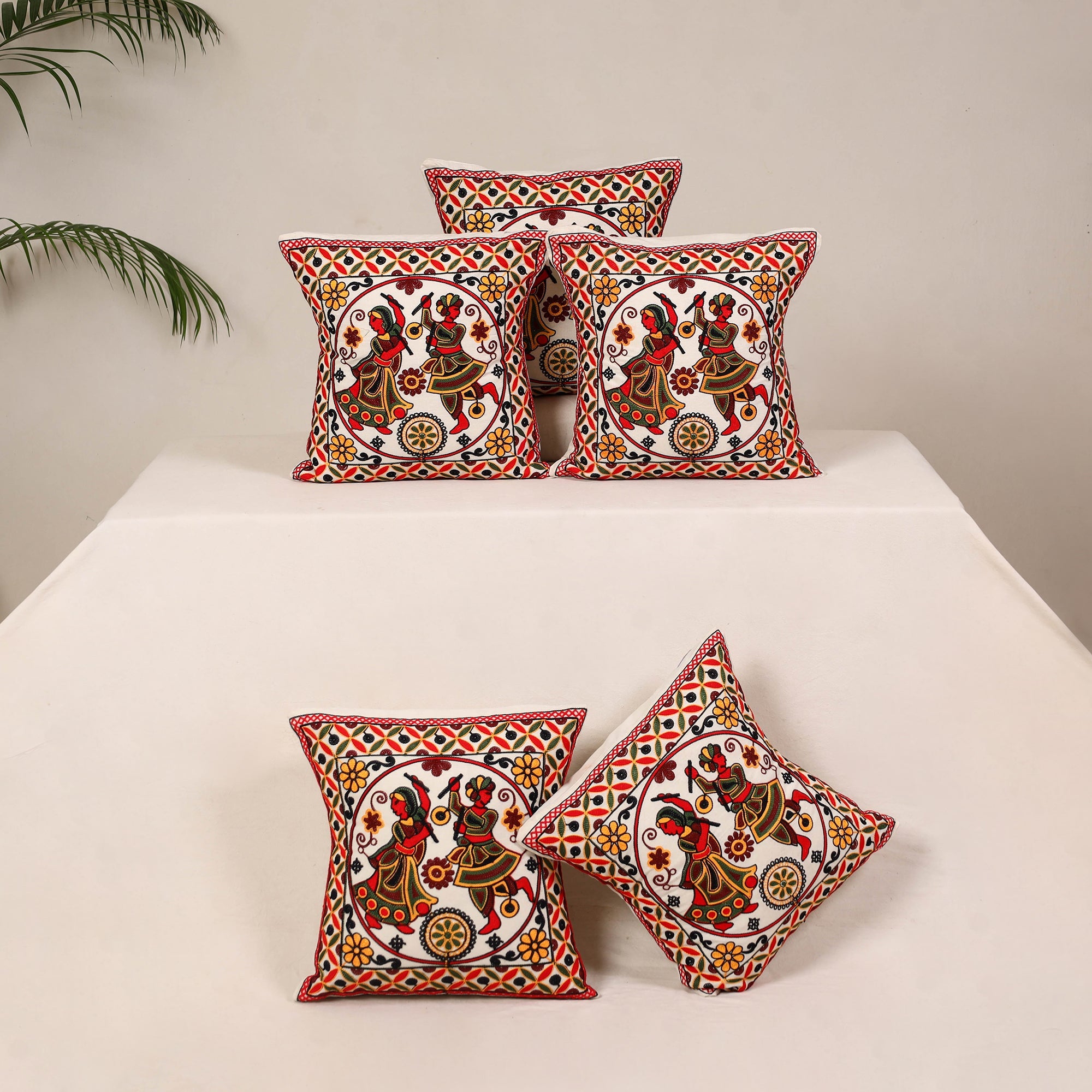 This red set of 5 cotton cushion covers features traditional kutch aari hand embroidery. Made using a fine needle and chain stitches, each cover displays elegant motifs inspired by Kutch’s rich art style. Carefully crafted by skilled artisans, these covers add colour, texture and a cultural charm to your home, bringing the warmth and beauty of Kutch into your living space.