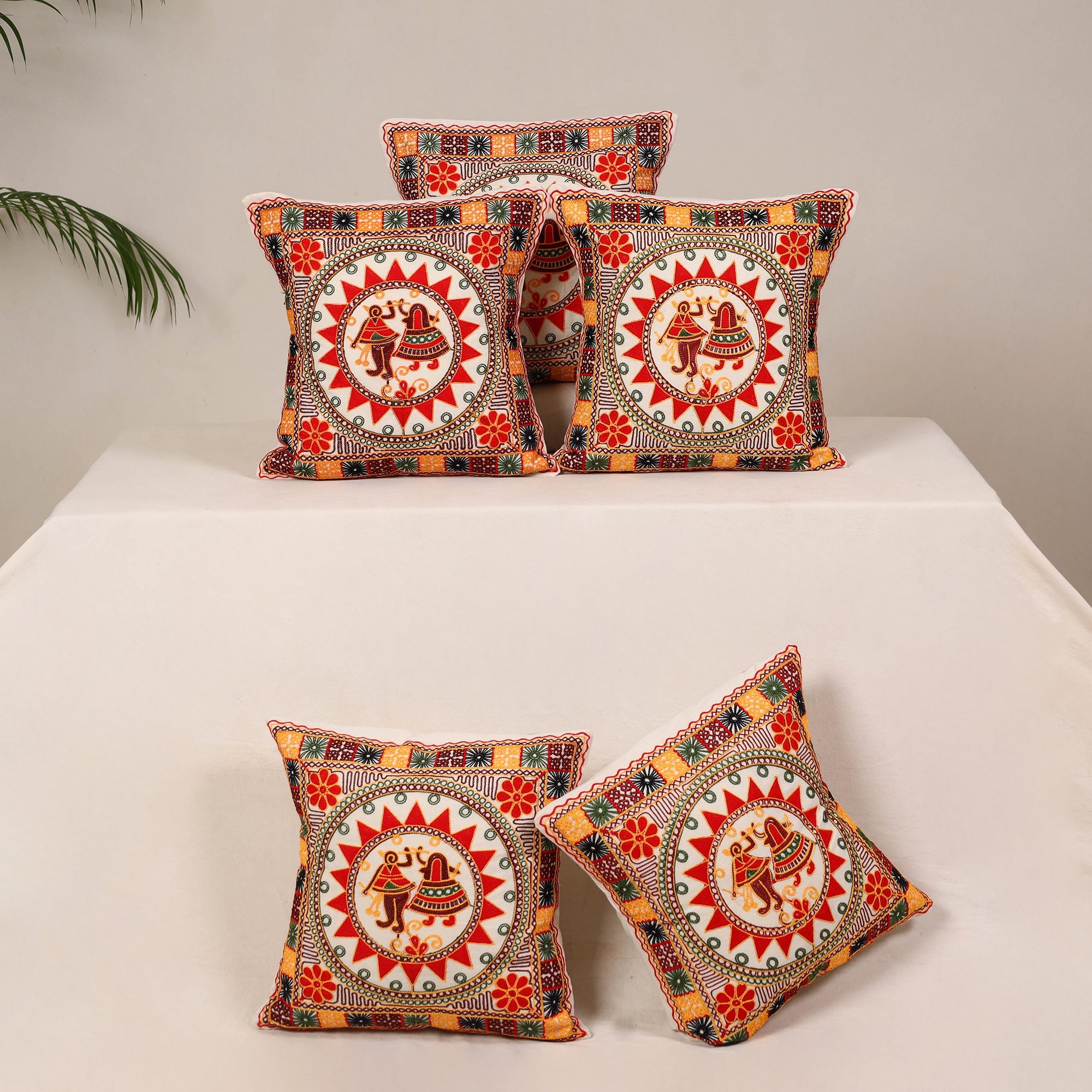 This red set of 5 cotton cushion covers features traditional kutch aari hand embroidery. Made using a fine needle and chain stitches, each cover displays elegant motifs inspired by Kutch’s rich art style. Carefully crafted by skilled artisans, these covers add colour, texture and a cultural charm to your home, bringing the warmth and beauty of Kutch into your living space.