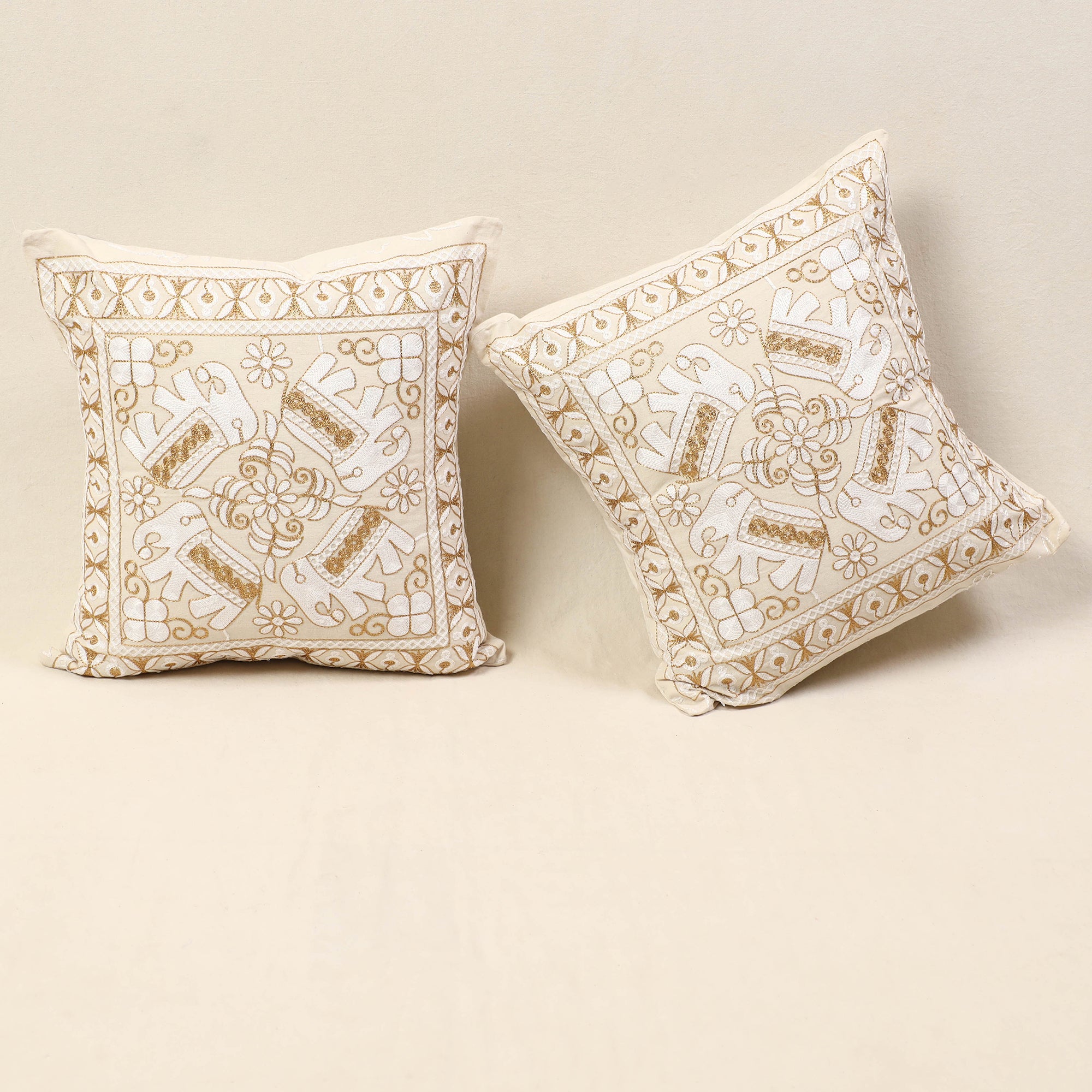 Bring home a slice of India’s vibrant heritage with this beige set of 5 aari embroidery cushion covers. Each piece is crafted from soft cotton and adorned with intricate hand embroidery by skilled artisans. Perfect for adding colour, texture, and a cultural touch to your living space.