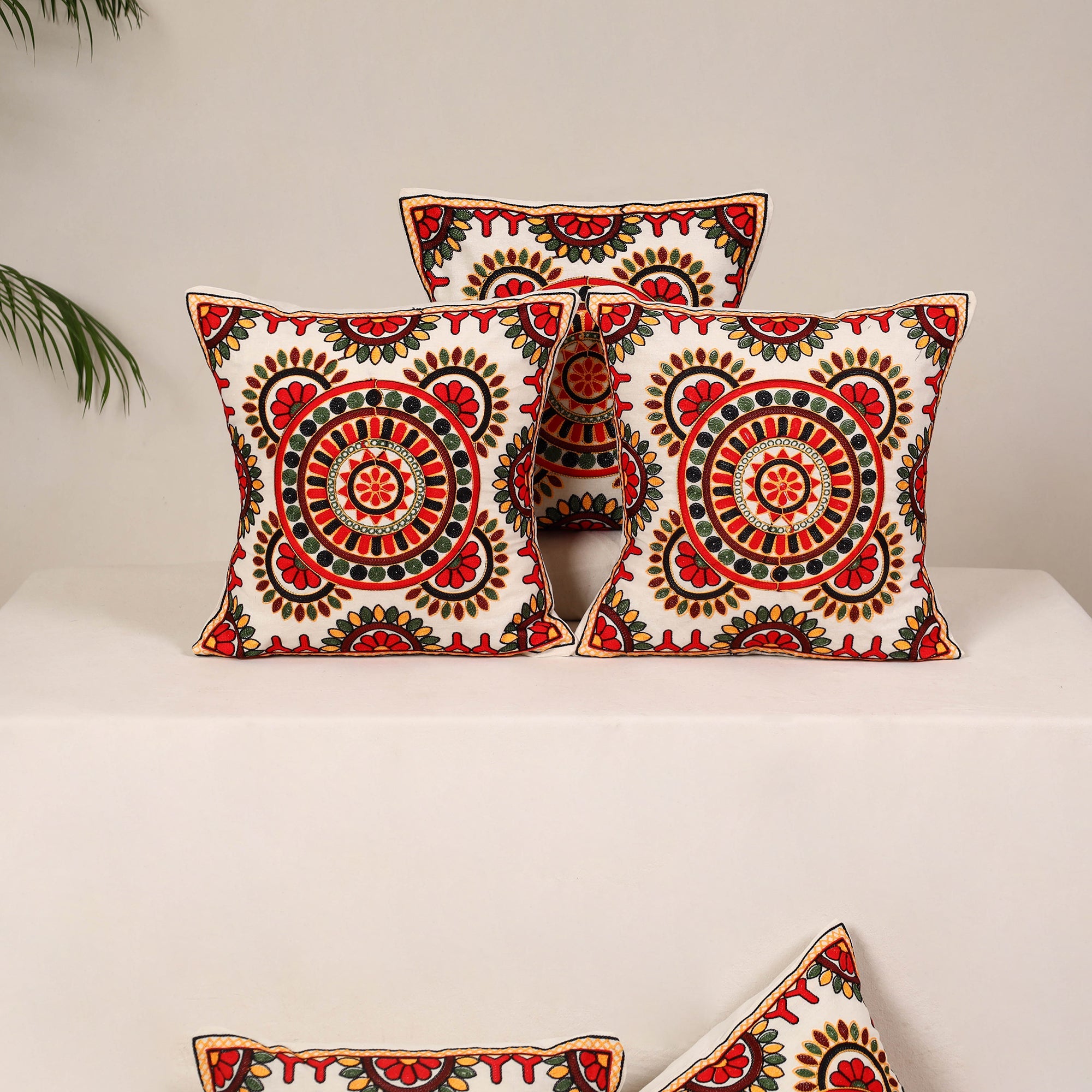 This red set of 5 cotton cushion covers features traditional kutch aari hand embroidery. Made using a fine needle and chain stitches, each cover displays elegant motifs inspired by Kutch’s rich art style. Carefully crafted by skilled artisans, these covers add colour, texture and a cultural charm to your home, bringing the warmth and beauty of Kutch into your living space.