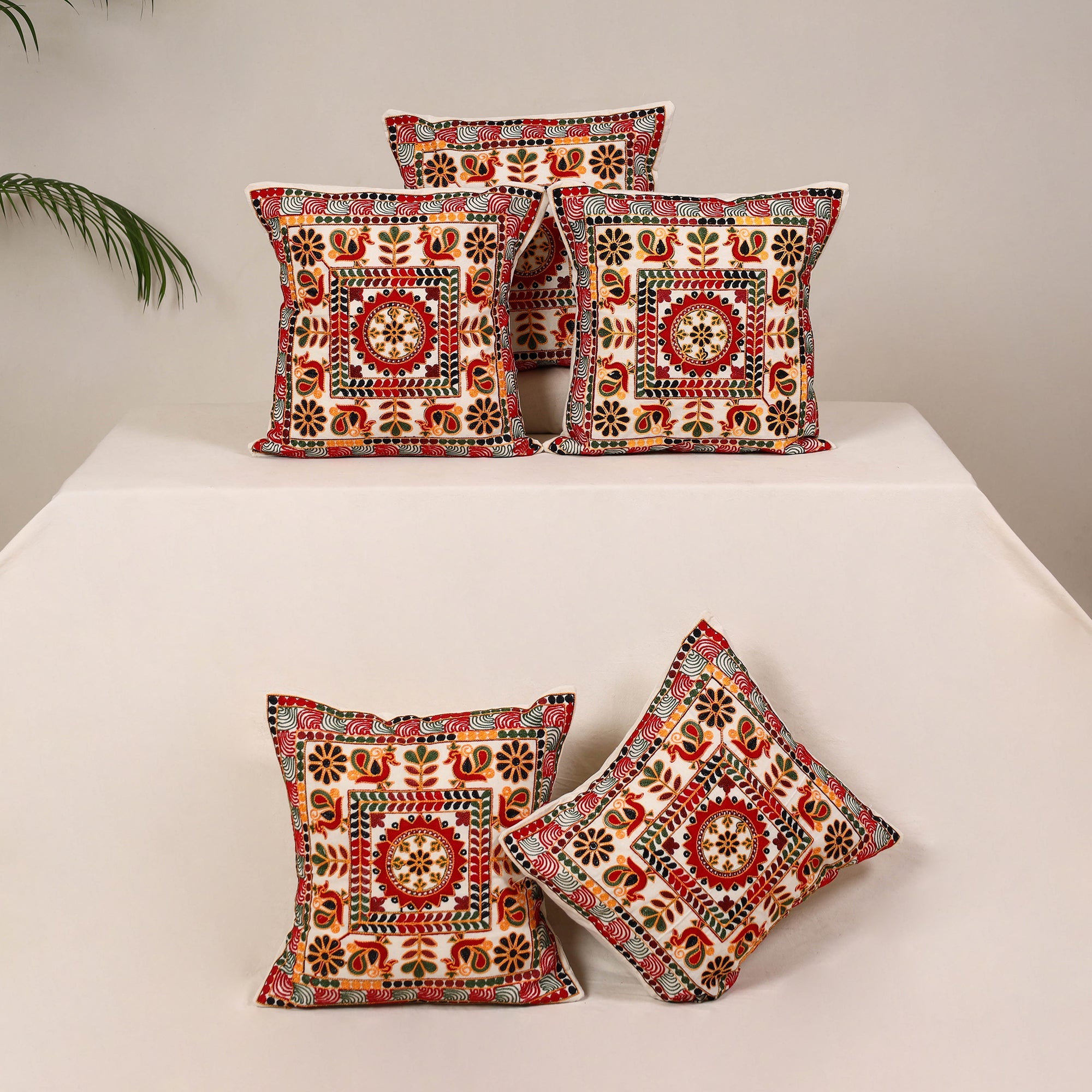 This red set of 5 cotton cushion covers features traditional kutch aari hand embroidery. Made using a fine needle and chain stitches, each cover displays elegant motifs inspired by Kutch’s rich art style. Carefully crafted by skilled artisans, these covers add colour, texture and a cultural charm to your home, bringing the warmth and beauty of Kutch into your living space.
