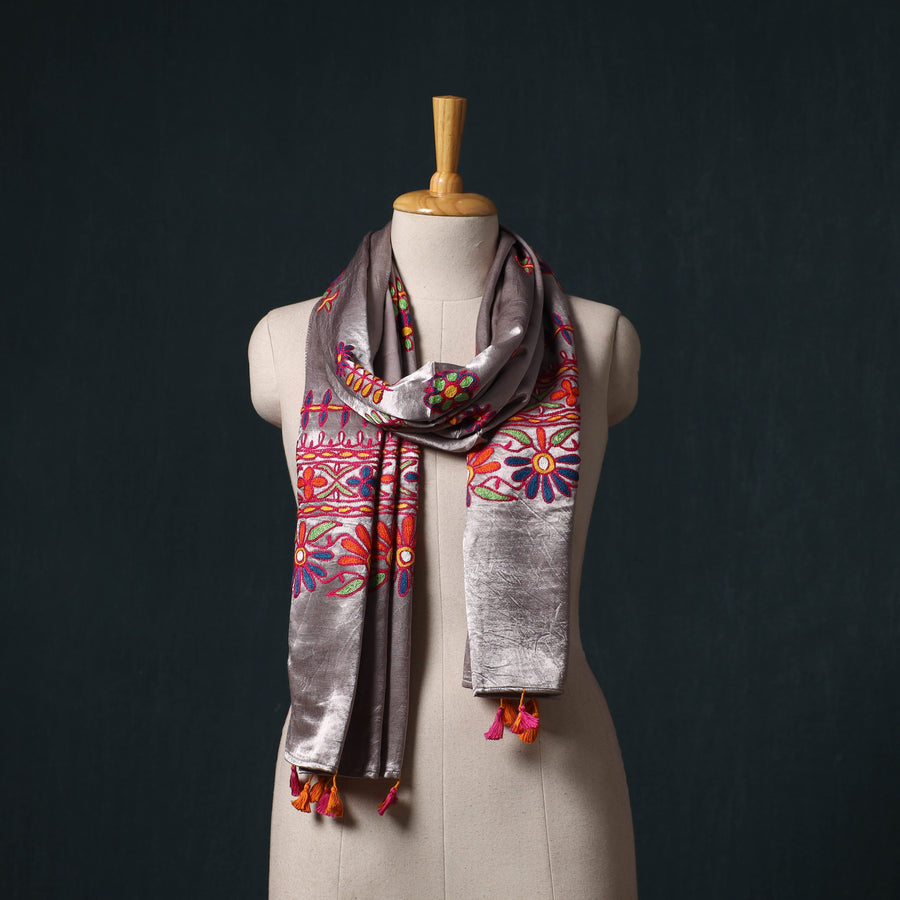 | Material | Brown kutch aari hand embroidery mashru silk stole is crafted in the Kutch region of Gujarat. Aari hand embroidery is a traditional art created using a hook needle called an “Aari” and fine silk threads to form intricate chain stitch patterns. Passed down through generations, this technique adds detailed motifs to the fabric. Made from a blend of mashru silk and cotton threads, the stole features soft cotton on one side and a lustrous silk finish on the other. It can be styled with ethnic or contemporary outfits for occasions or everyday wear. |