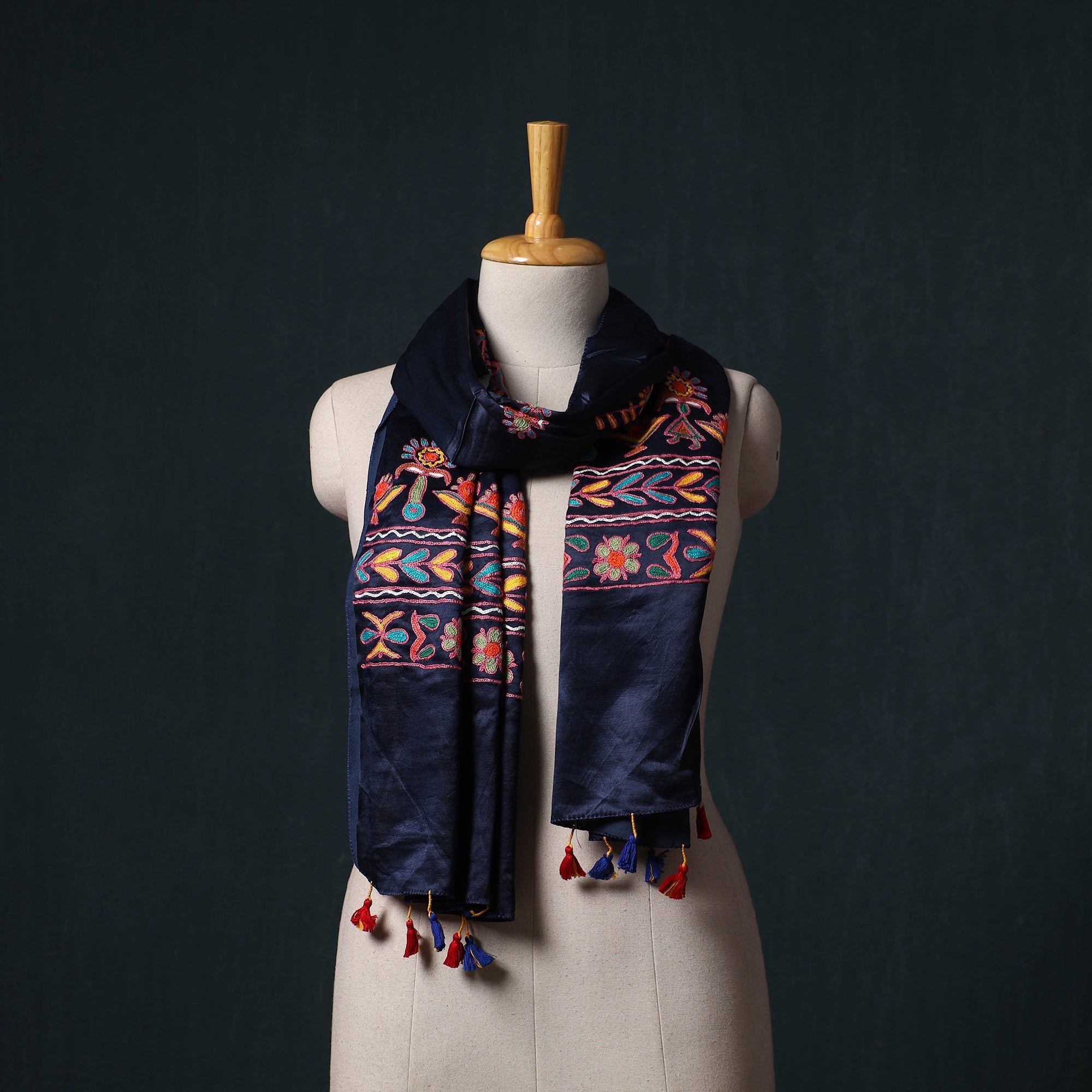 | Material | Blue kutch aari hand embroidery mashru silk stole is crafted in the Kutch region of Gujarat. Aari hand embroidery is a traditional art created using a hook needle called an “Aari” and fine silk threads to form intricate chain stitch patterns. Passed down through generations, this technique adds detailed motifs to the fabric. Made from a blend of mashru silk and cotton threads, the stole features soft cotton on one side and a lustrous silk finish on the other. It can be styled with ethnic or contemporary outfits for occasions or everyday wear. |