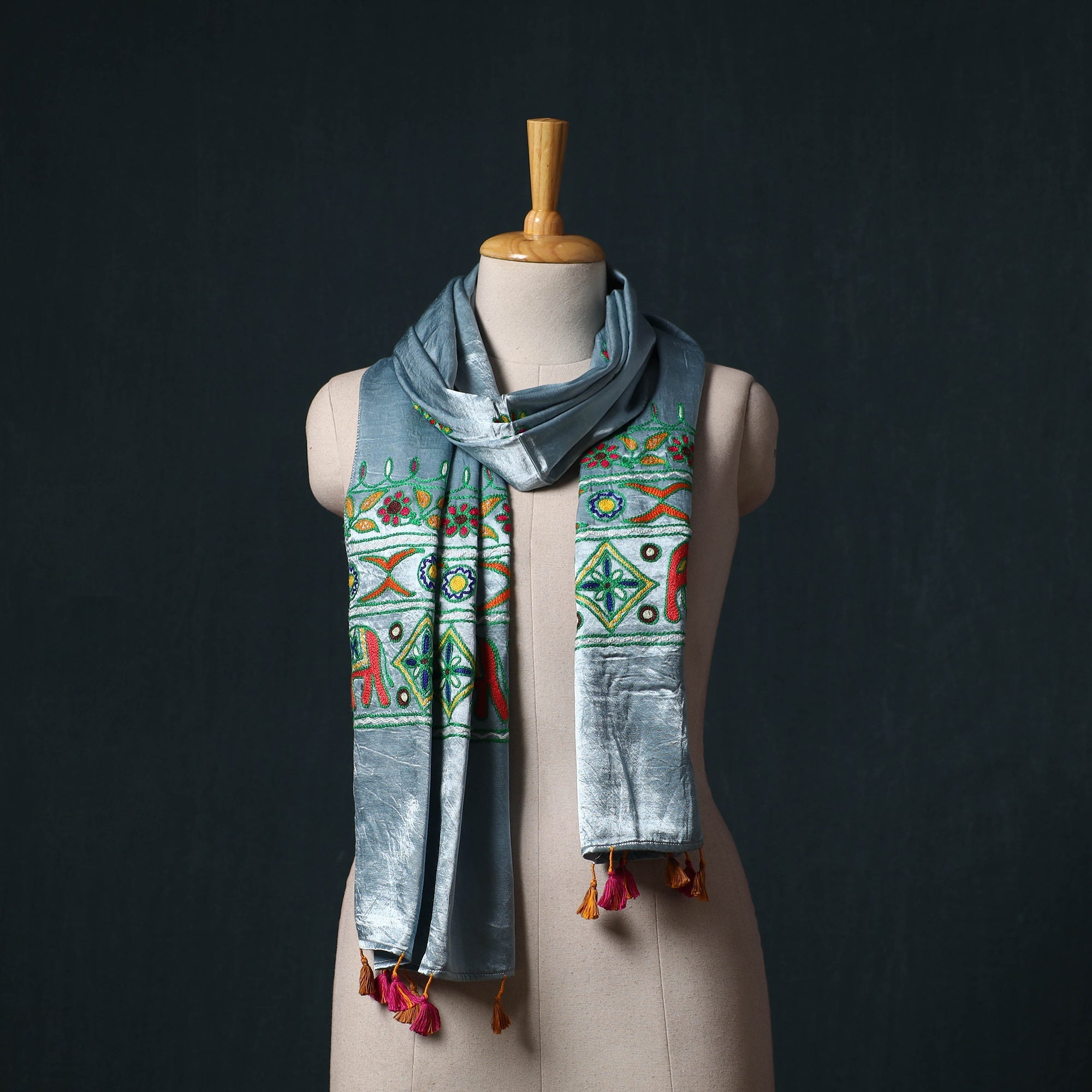 Blue - Kutch Aari Hand Embroidery Mashru Silk Stole 60