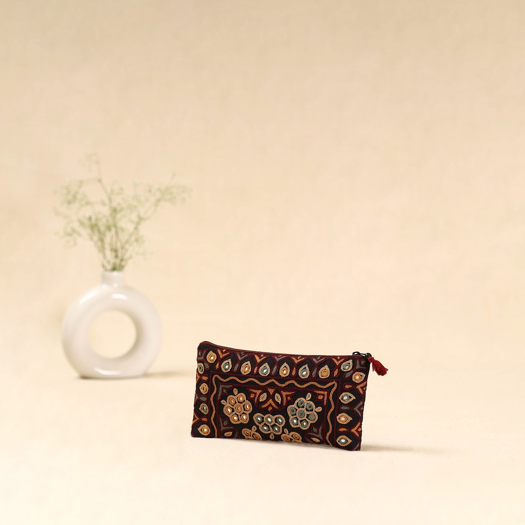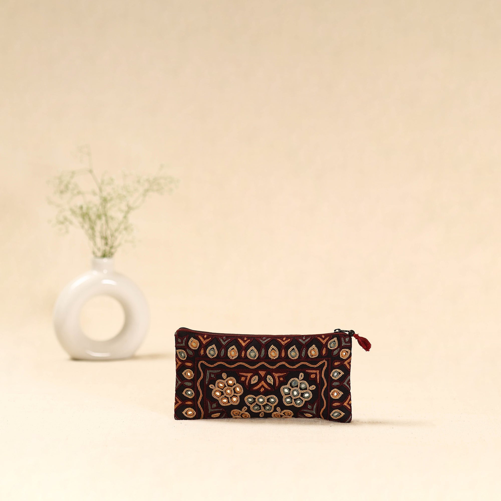 | Material | Black clutch purse features ahir hand embroidery from Kutch, made by Ahir and Meghwaad Gurjar women. Known for its bold “thassa” style, the embroidery is filled with colourful motifs and mirrors inspired by nature. Using fine stitches like saankdi and bakhiyo, it beautifully blends tradition and modern design. Includes an inner zipper pocket for essentials. |