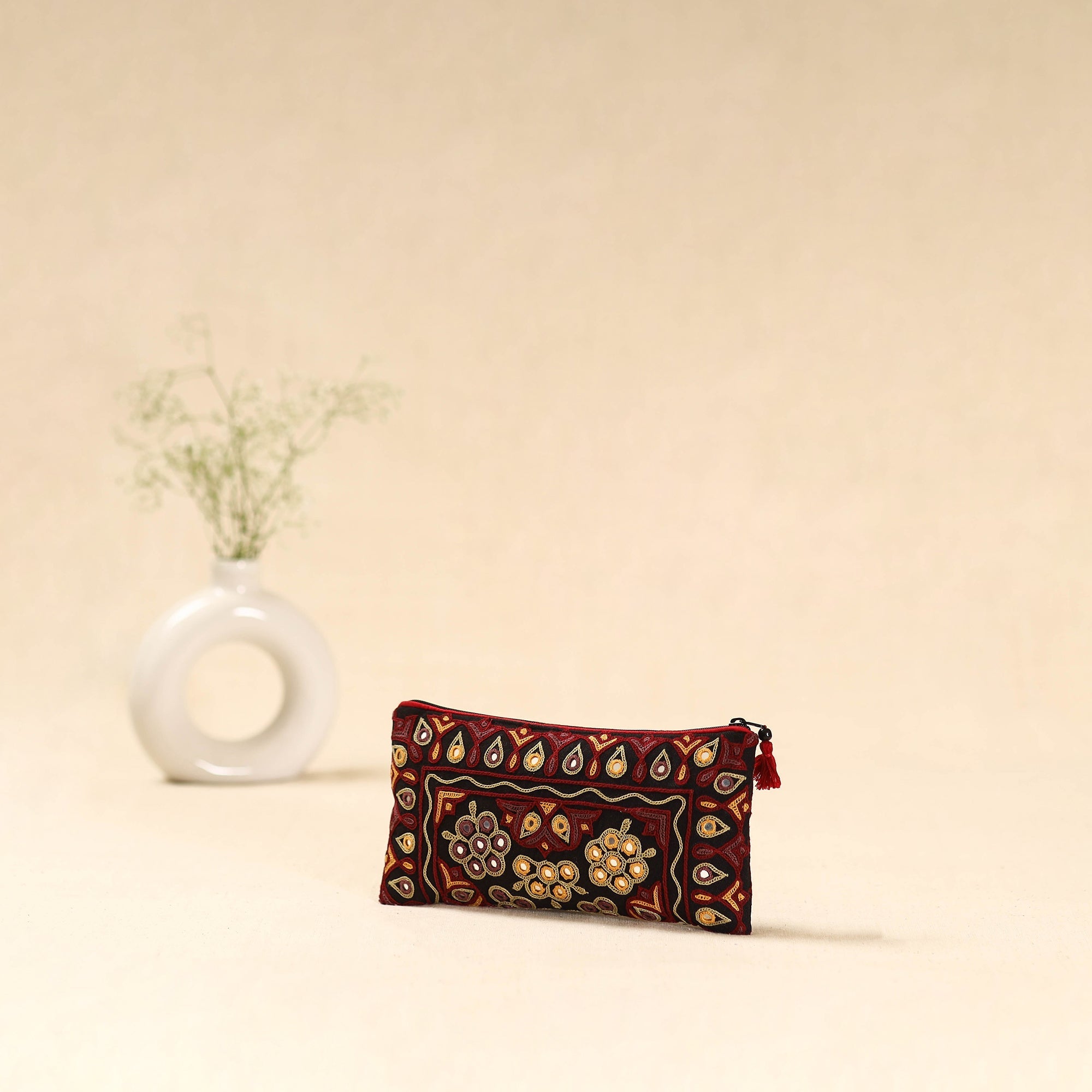 Black clutch purse features ahir hand embroidery from Kutch, made by Ahir and Meghwaad Gurjar women. Known for its bold “thassa” style, the embroidery is filled with colourful motifs and mirrors inspired by nature. Using fine stitches like saankdi and bakhiyo, it beautifully blends tradition and modern design. Includes an inner zipper pocket for essentials.