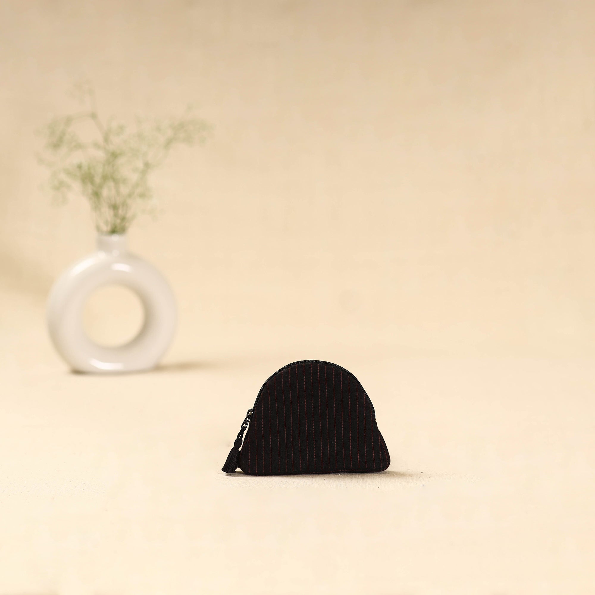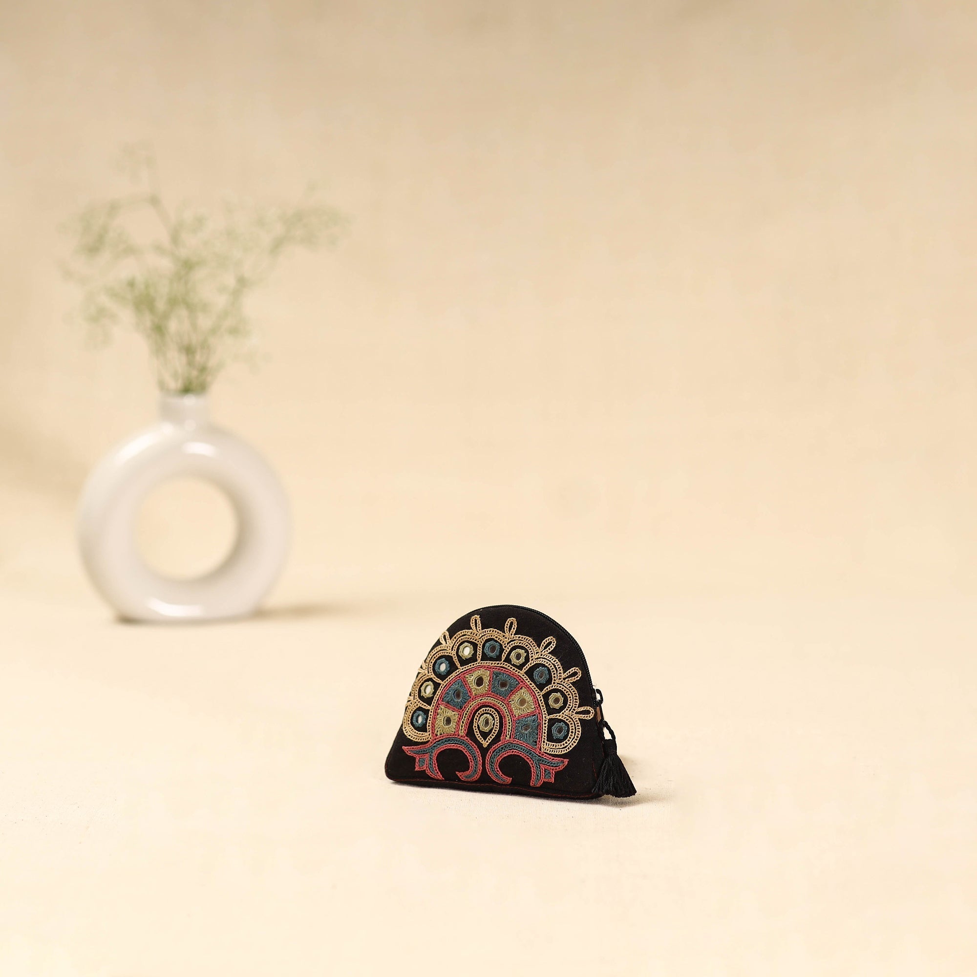 This black cotton coin pouch features ahir hand embroidery from Kutch, made by Ahir and Meghwaad Gurjar women. Known for its bold “thassa” style, the embroidery is filled with colourful motifs and mirrors inspired by nature. Using fine stitches like saankdi and bakhiyo, it beautifully blends tradition and modern design. Perfect for carrying coins, keys, or other small essentials.