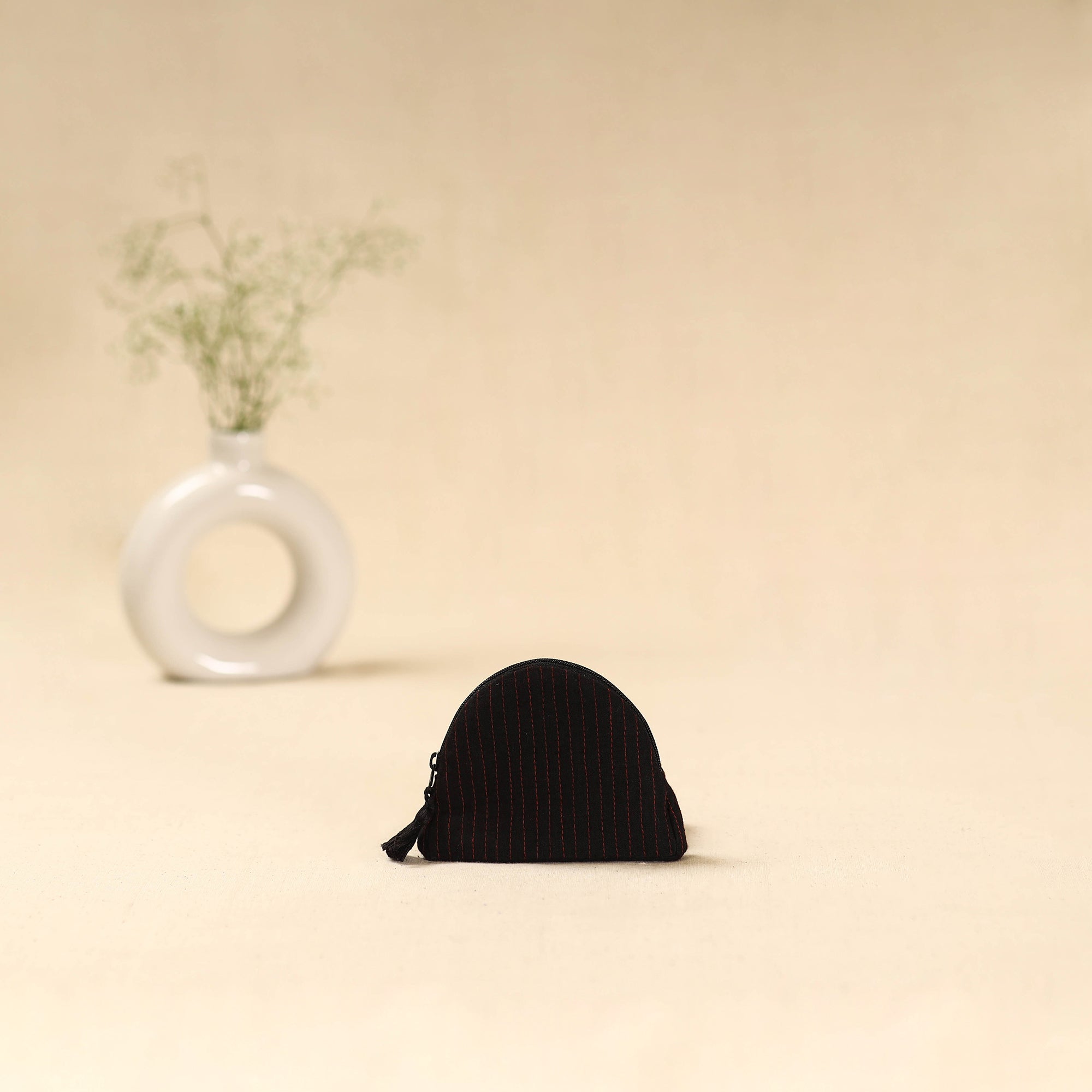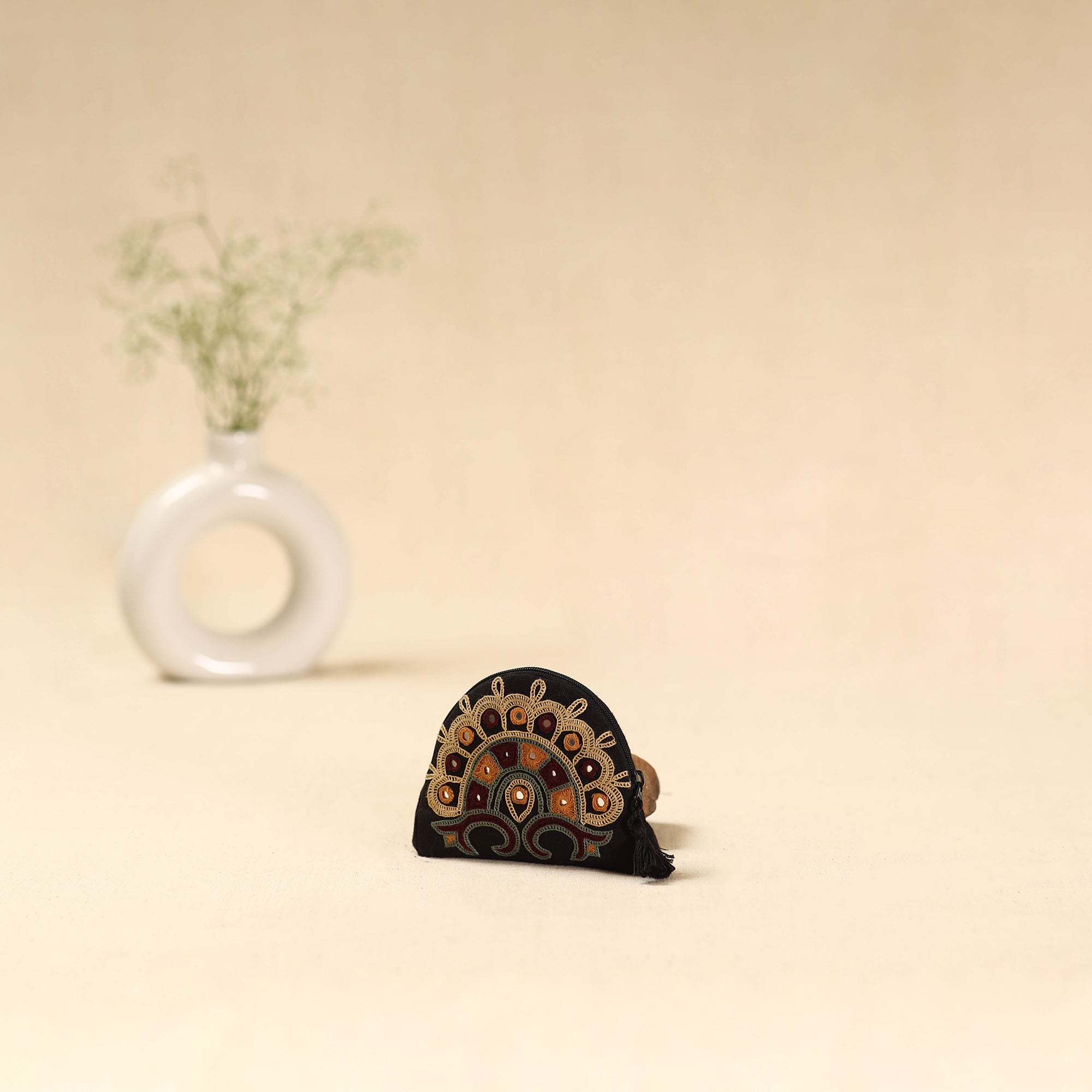 This black cotton coin pouch features ahir hand embroidery from Kutch, made by Ahir and Meghwaad Gurjar women. Known for its bold “thassa” style, the embroidery is filled with colourful motifs and mirrors inspired by nature. Using fine stitches like saankdi and bakhiyo, it beautifully blends tradition and modern design. Perfect for carrying coins, keys, or other small essentials.