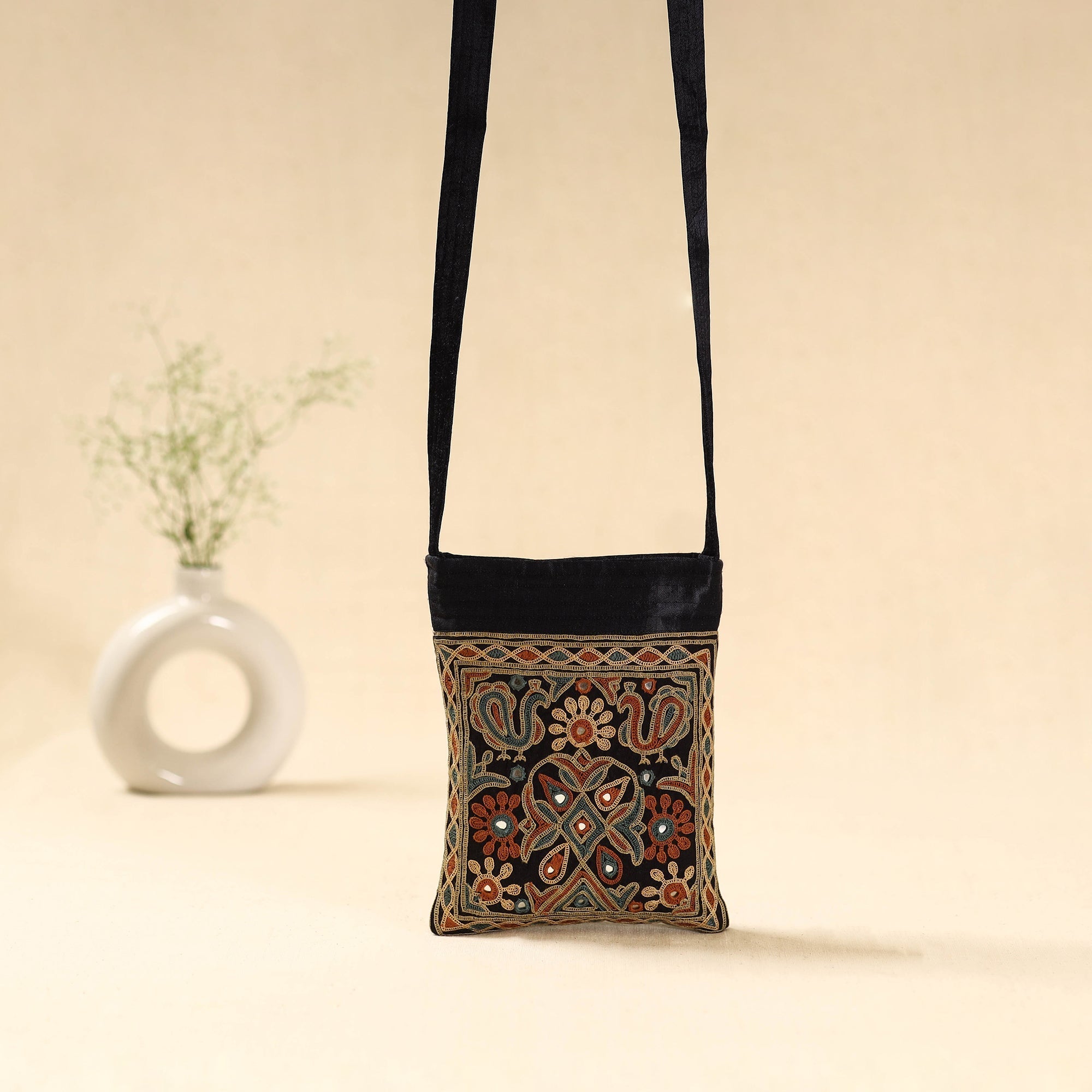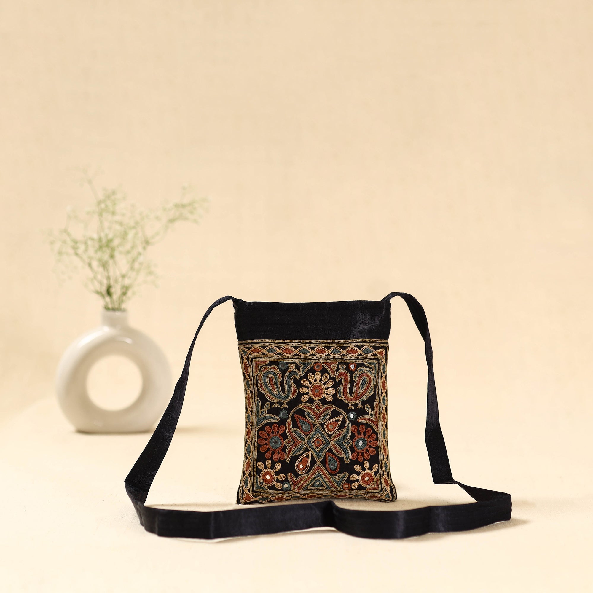 This black mashru silk sling bag features ahir embroidery from Kutch, made by Ahir and Meghwaad Gurjar women. Known for its bold “thassa” style, the embroidery is filled with colourful motifs and mirrors. Using fine stitches like saankdi and bakhiyo, it beautifully blends tradition and modern design. Includes an inner zipper pocket for essentials and an outer zipper pocket for easy access.