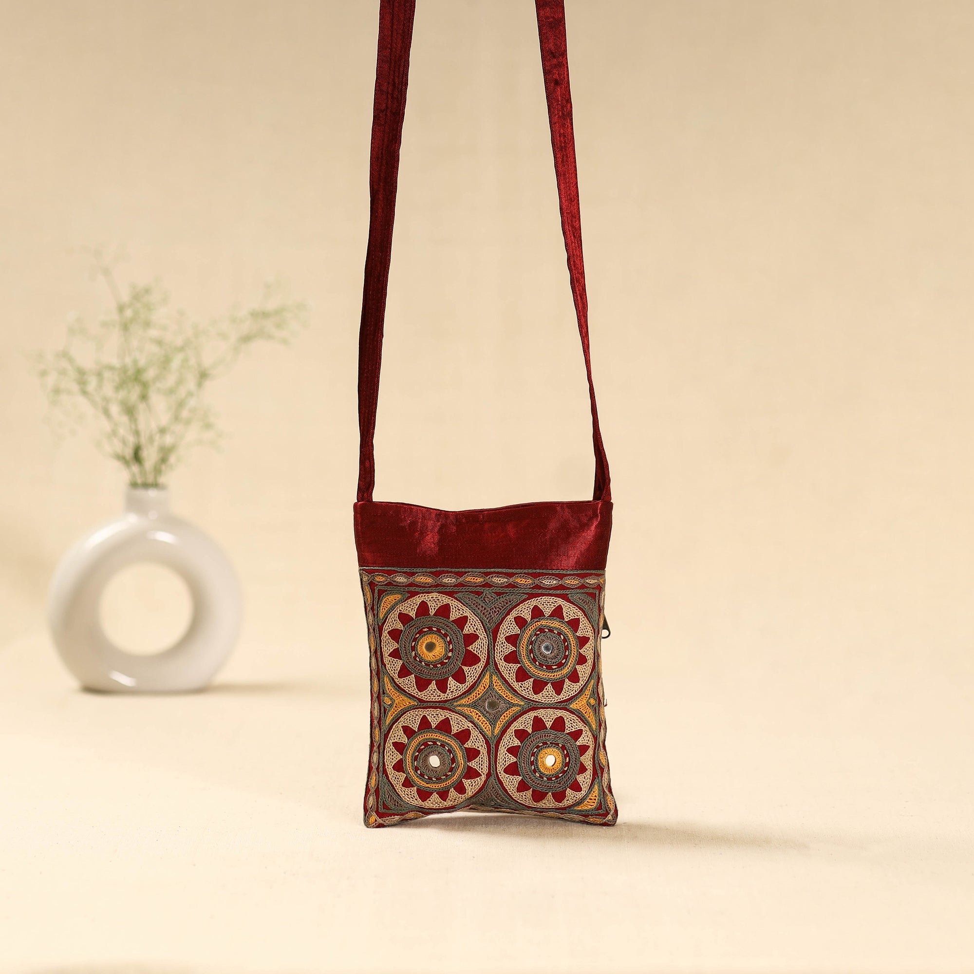 This red mashru silk sling bag features ahir embroidery from Kutch, made by Ahir and Meghwaad Gurjar women. Known for its bold “thassa” style, the embroidery is filled with colourful motifs and mirrors. Using fine stitches like saankdi and bakhiyo, it beautifully blends tradition and modern design. Includes an inner zipper pocket for essentials and an outer zipper pocket for easy access.