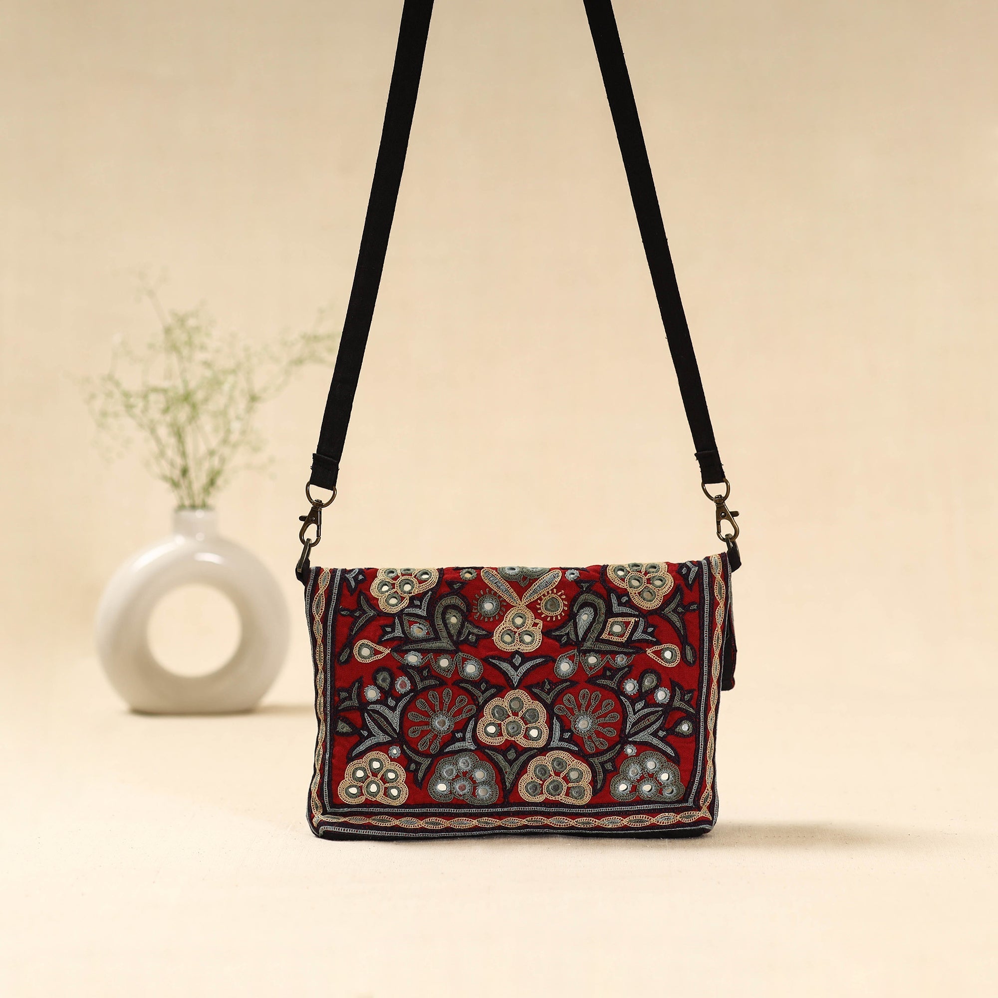 This black sling bag features ahir hand embroidery from Kutch, made by Ahir and Meghwaad Gurjar women. Known for its bold “thassa” style, the embroidery is filled with colourful motifs and mirrors inspired by nature. Using fine stitches like saankdi and bakhiyo, it beautifully blends tradition and modern design. Includes an outer zipper pocket and ample space inside for everyday essentials.