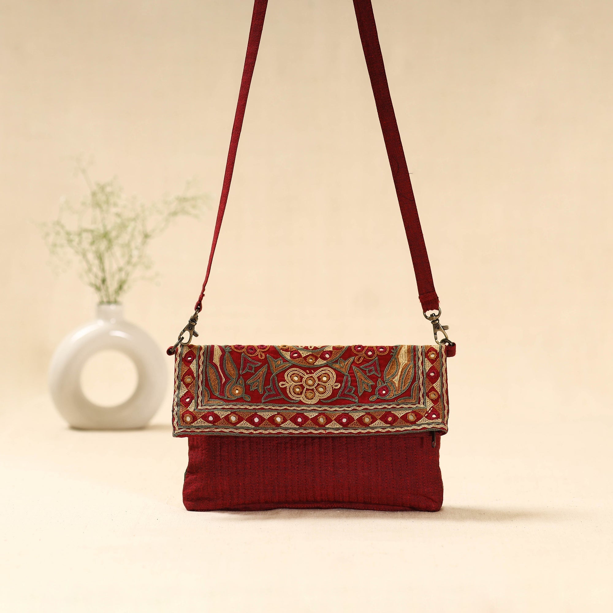 This red sling bag features ahir hand embroidery from Kutch, made by Ahir and Meghwaad Gurjar women. Known for its bold “thassa” style, the embroidery is filled with colourful motifs and mirrors inspired by nature. Using fine stitches like saankdi and bakhiyo, it beautifully blends tradition and modern design. Includes an outer zipper pocket and ample space inside for everyday essentials.
