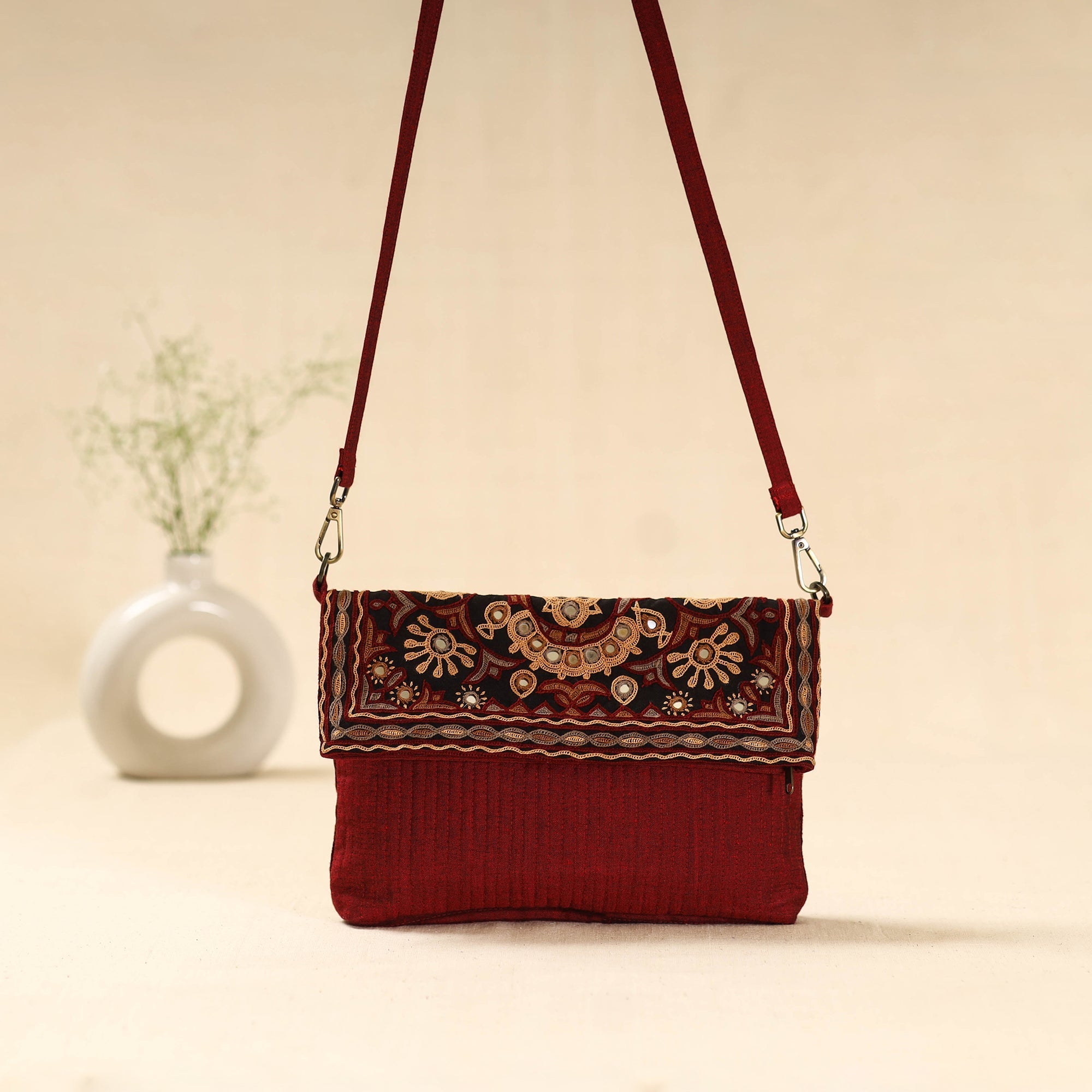 This red sling bag features ahir hand embroidery from Kutch, made by Ahir and Meghwaad Gurjar women. Known for its bold “thassa” style, the embroidery is filled with colourful motifs and mirrors inspired by nature. Using fine stitches like saankdi and bakhiyo, it beautifully blends tradition and modern design. Includes an outer zipper pocket and ample space inside for everyday essentials.