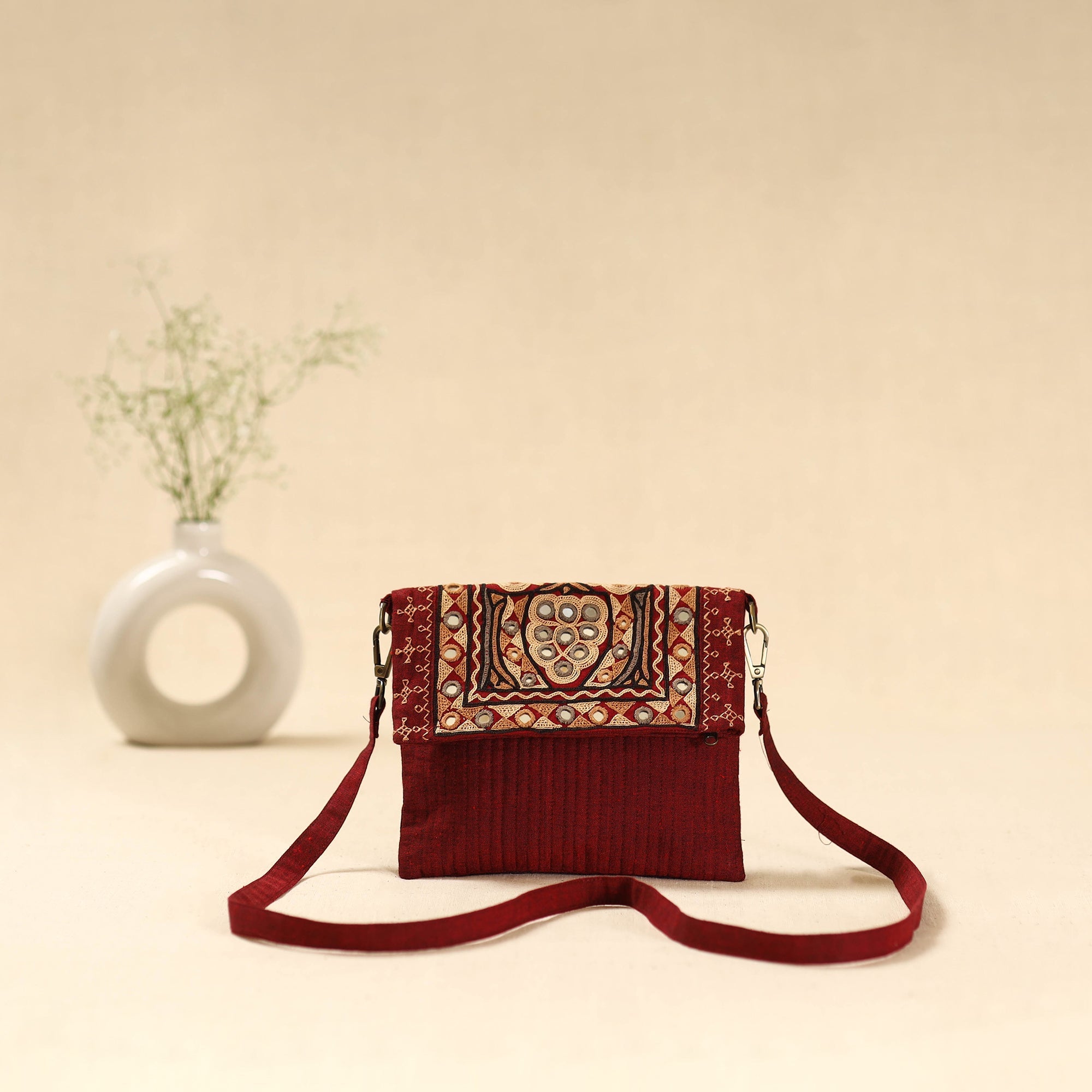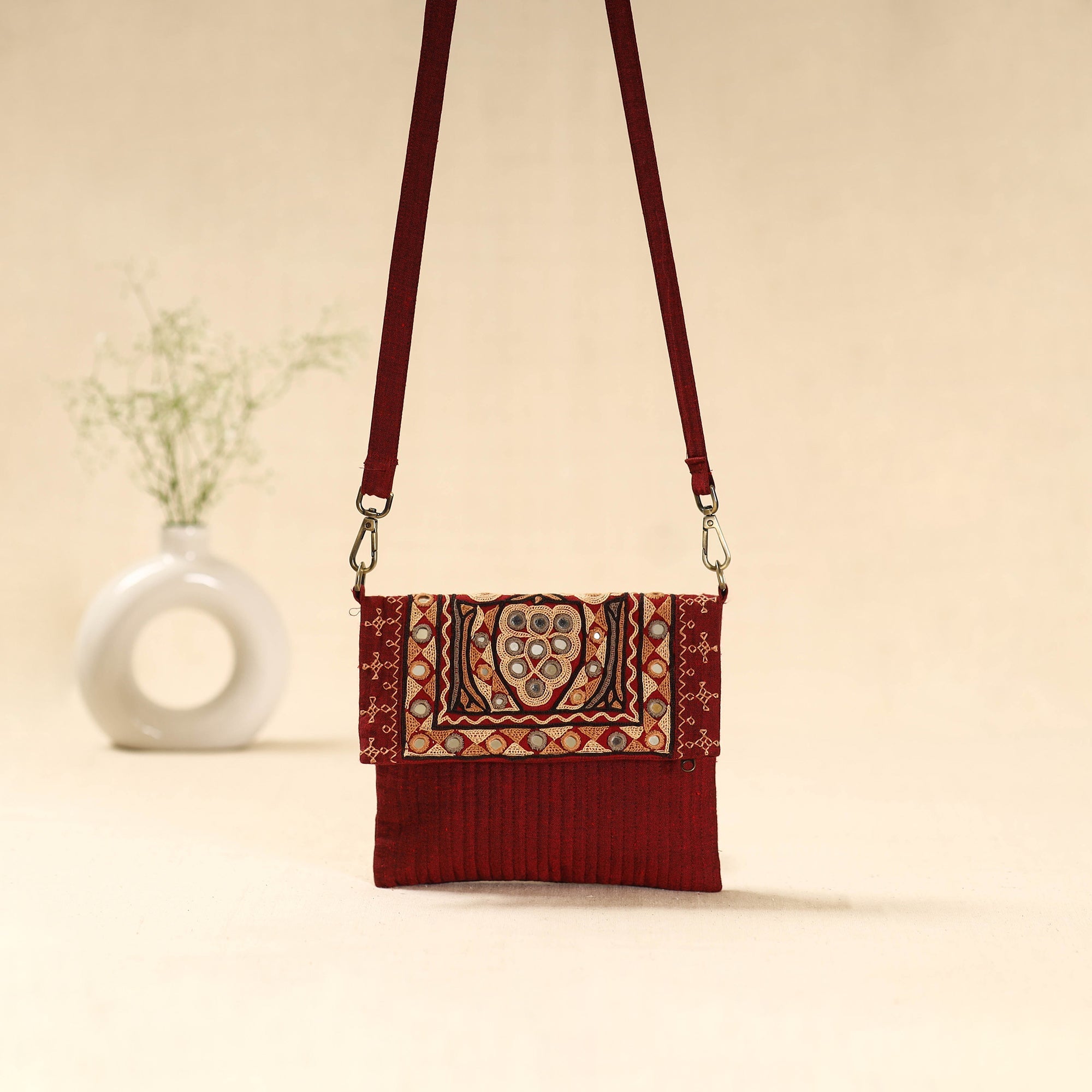 This red sling bag features ahir hand embroidery from Kutch, made by Ahir and Meghwaad Gurjar women. Known for its bold “thassa” style, the embroidery is filled with colourful motifs and mirrors inspired by nature. Using fine stitches like saankdi and bakhiyo, it beautifully blends tradition and modern design. Includes an outer zipper pocket and ample space inside for everyday essentials.
