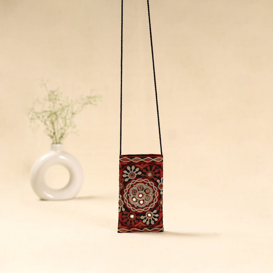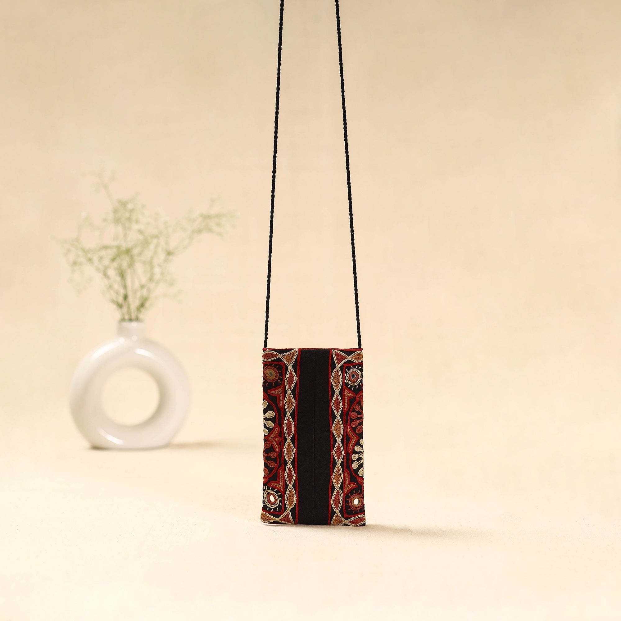 This black cotton sling dori mobile pouch features Ahir hand embroidery from Kutch, made by Ahir and Meghwaad Gurjar women. Known for its bold “thassa” style, the embroidery is filled with colourful motifs and mirrors inspired by nature. Using fine stitches like saankdi and bakhiyo, it beautifully blends tradition and modern design. Perfect for carrying your phone and small essentials with ease.