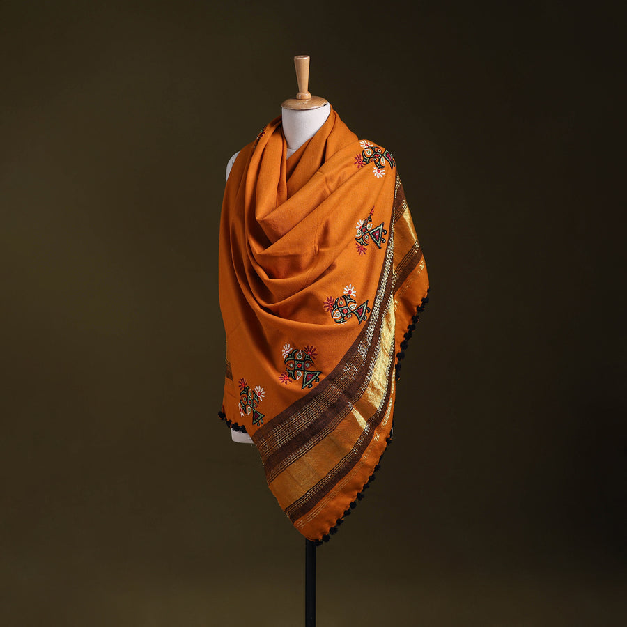 Wrap yourself in the heritage of Kutch with this orange ahir hand embroidery mirror work woollen shawl, beautifully adorned with a zari border. Crafted by skilled artisans from Bhuj, Gujarat, it reflects the timeless charm of regional artistry. Made from soft acrylic wool, the shawl combines warmth, comfort, and elegance. A perfect blend of tradition and contemporary style, ideal for adding a graceful touch to your everyday look or festive ensemble.