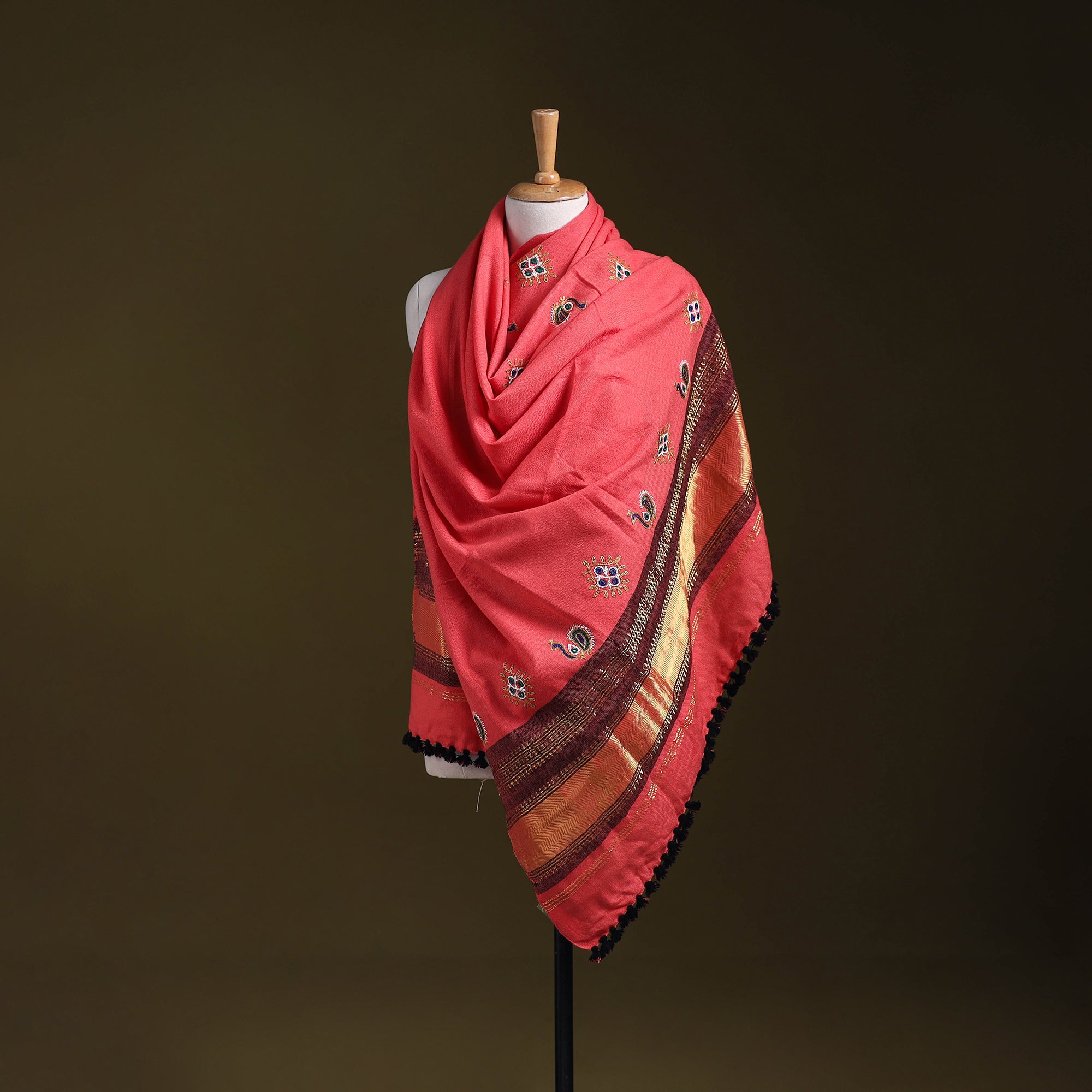 Wrap yourself in the heritage of Kutch with this pink ahir hand embroidery mirror work woollen shawl, beautifully adorned with a zari border. Crafted by skilled artisans from Bhuj, Gujarat, it reflects the timeless charm of regional artistry. Made from soft acrylic wool, the shawl combines warmth, comfort, and elegance. A perfect blend of tradition and contemporary style, ideal for adding a graceful touch to your everyday look or festive ensemble.