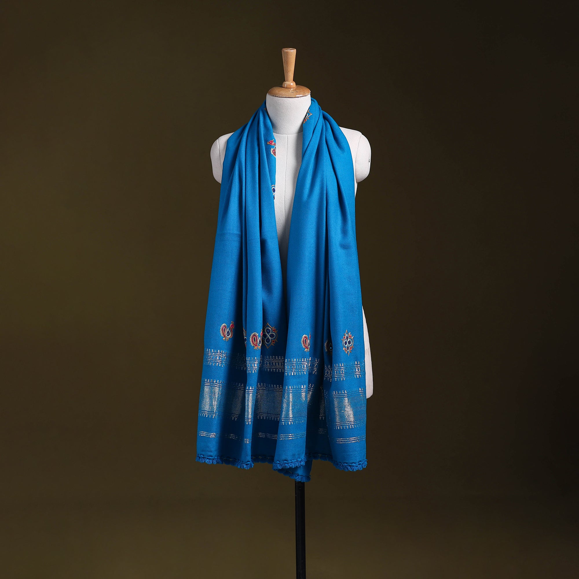 Wrap yourself in the heritage of Kutch with this blue ahir hand embroidery mirror work woollen shawl, beautifully adorned with a zari border. Crafted by skilled artisans from Bhuj, Gujarat, it reflects the timeless charm of regional artistry. Made from soft acrylic wool, the shawl combines warmth, comfort, and elegance. A perfect blend of tradition and contemporary style, ideal for adding a graceful touch to your everyday look or festive ensemble.